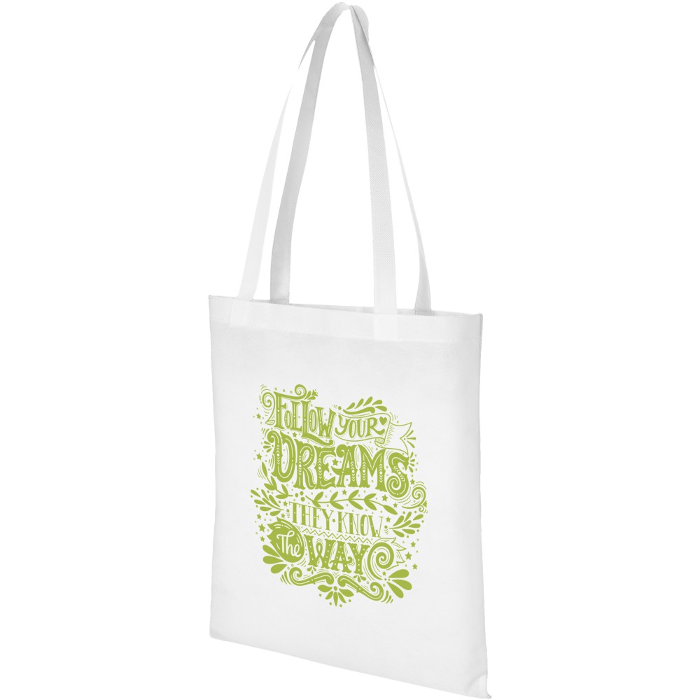 A Zeus nagyméretű, nemszőtt táska tökéletes választás konferenciákra, kiállításokra. Fülek magassága 29,2 cm. Újrahasznosítható anyag. 80 g/m2 nemszőtt polipropilén.