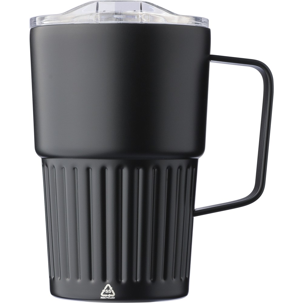 Újrahasznosított rozsdamentes acél útibögre, 450 ml. A belső 304-es, a külső 201-es rozsdamentes acélból készült, bordás markolattal és masszív fogantyúval, műanyag, csúszózáras fedéllel. Gravírozott újrahasznosított logó található a bögrén. Csomagolása barna papírdoboz.
