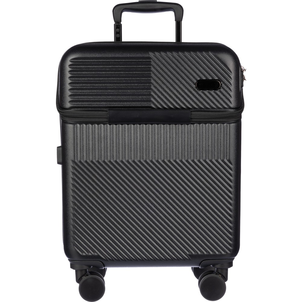 Gurulós bőrönd cipzáras laptop zsebbel, 8 kerékkel és háromszintű fogantyúrendszerrel. Beépített számzár és külön lapocska a lézergravírozáshoz. USB porttal.