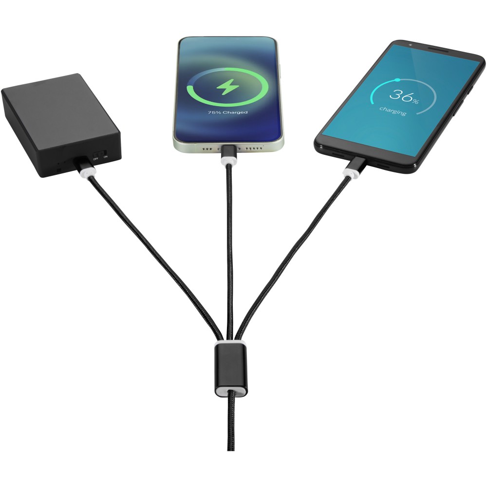 Fonott nejlon töltőkábel 5 különböző csatlakozóval: C típusú bemenet, USB-A bemenet, C típusú kimenet, Apple iOS kimenet és mikro USB kimenet. Ez lehetővé teszi a kábel használatát C típusú kimeneti eszközökkel is, amelyek az új generációs telefonok és MacBook számítógépek részét képezik. A kábel hossza 100 cm. 2 az 1-ben kimenet 2A-ig. C típusú kimenet 3A-ig.
