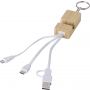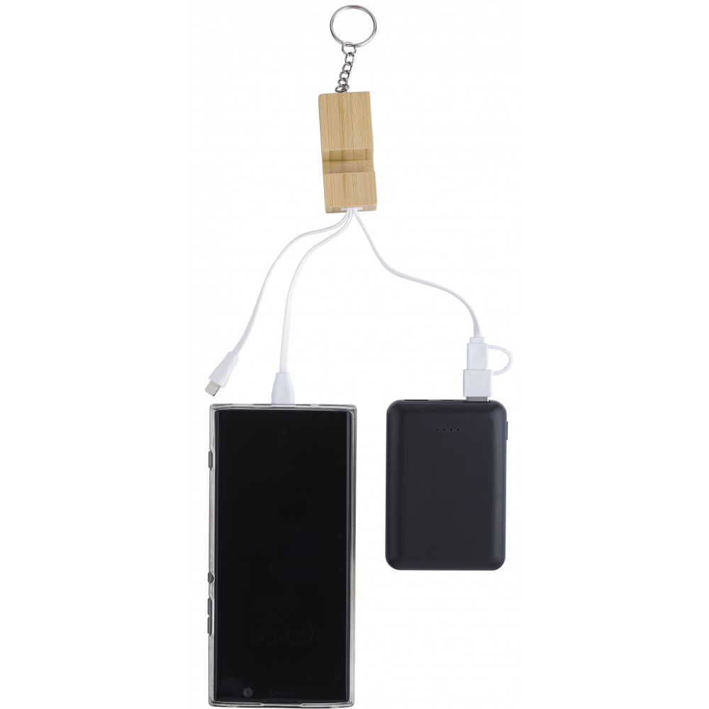 Bambusz telefontartó kulcstartóval, töltőkábelekkel. Csatlakozók: C-típusú, lightning, USB-A/C. Csomagolása barna papírdoboz.