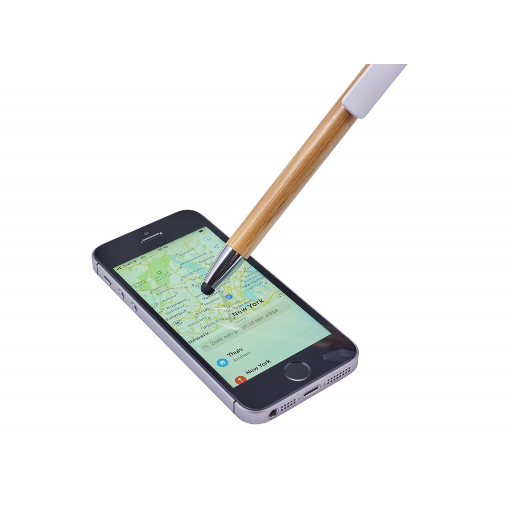 Golyóstoll és érintő kék tollbetéttel, műanyag klipsszel és nyomógombbal. A klipsz nyomógombként funkcionál, és okostelefon-állványként is használható. ABS, bambusz.