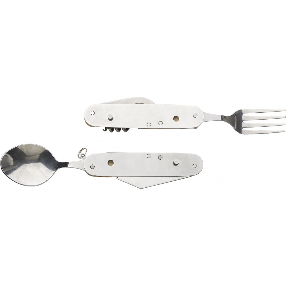 Többfunkciós evőeszköz bambusz nyéllel. Az eszköz szétszedhető a kétkezes étkezés érdekében. Csomagolása barna papírdoboz.
