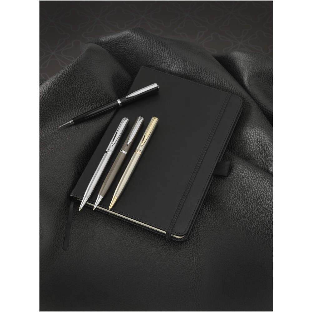 Kifinomult tervezésű golyóstoll matt arany felülettel és aranyozott részletekkel, valamint matt króm felülettel és króm kiegészítőkkel. Prémium minőségű fekete tollbetéttel. Csomagolása Luxe ajándékdoboz.Fém.