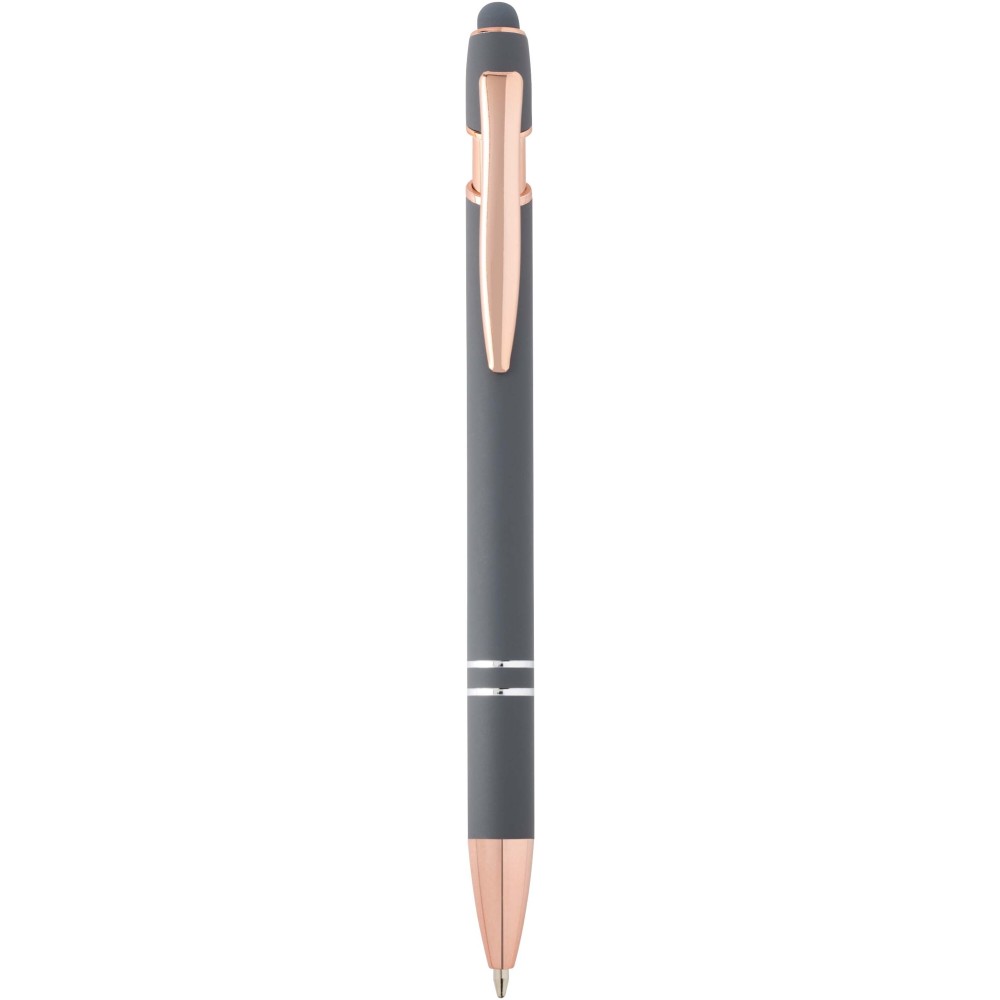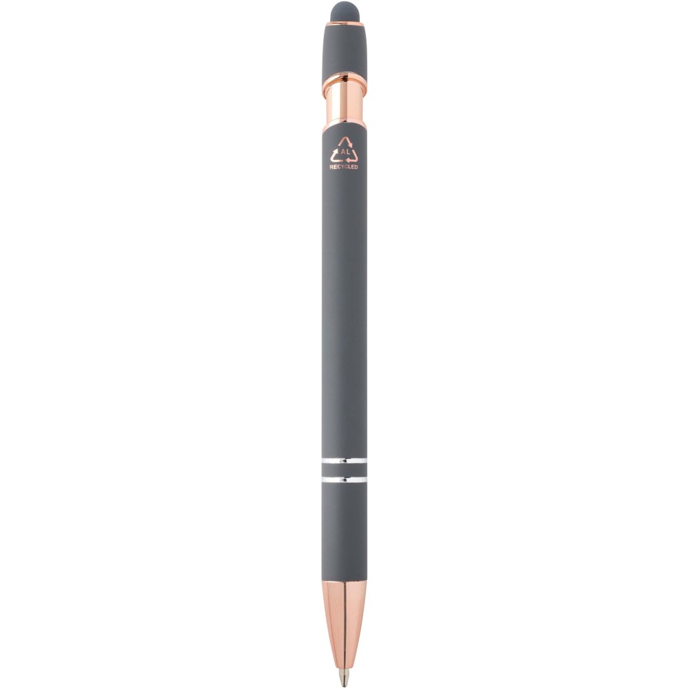 Nanna golyóstoll elegáns rózsaarany színben. A toll teste újrahasznosított alumíniumból, az érintőceruza pedig szilikonból készült, így érintőképernyős eszközökhöz is használható. Az újrahasznosított alumínium csökkenti a hulladéklerakók terhelését, segít megőrizni a természeti erőforrásokat, és célja az üvegházhatású gázok kibocsátásának mérséklése. Tinta színe: kék. Íráshossz: 800 méter. Tollhegy mérete: 1,0 mm.