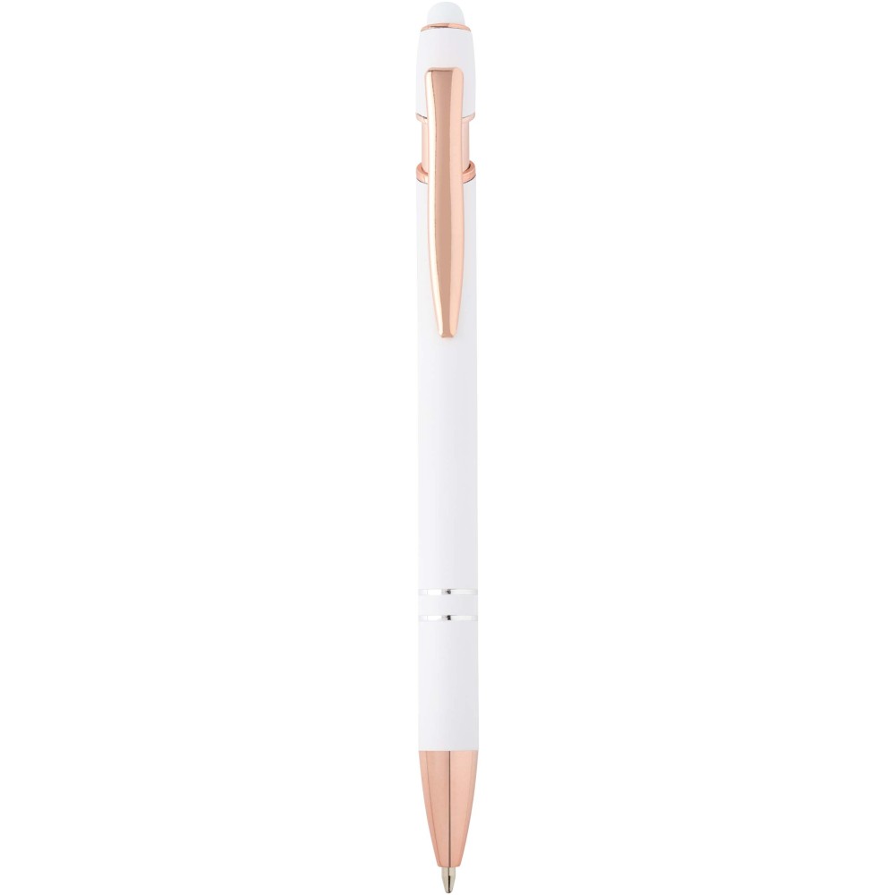 A Nanna golyóstoll rózsaarany bevonattal újrahasznosított alumíniumból készült tolltesttel és szilikon, érintőképernyős véggel rendelkezik. Az újrahasznosított alumínium csökkenti a hulladék mennyiségét a lerakókban, hozzájárul a természeti erőforrások megőrzéséhez és a károsanyag-kibocsátás mérsékléséhez. Tinta színe: fekete. Íráshossz: 800 méter. Tollhegy mérete: 1,0 mm.