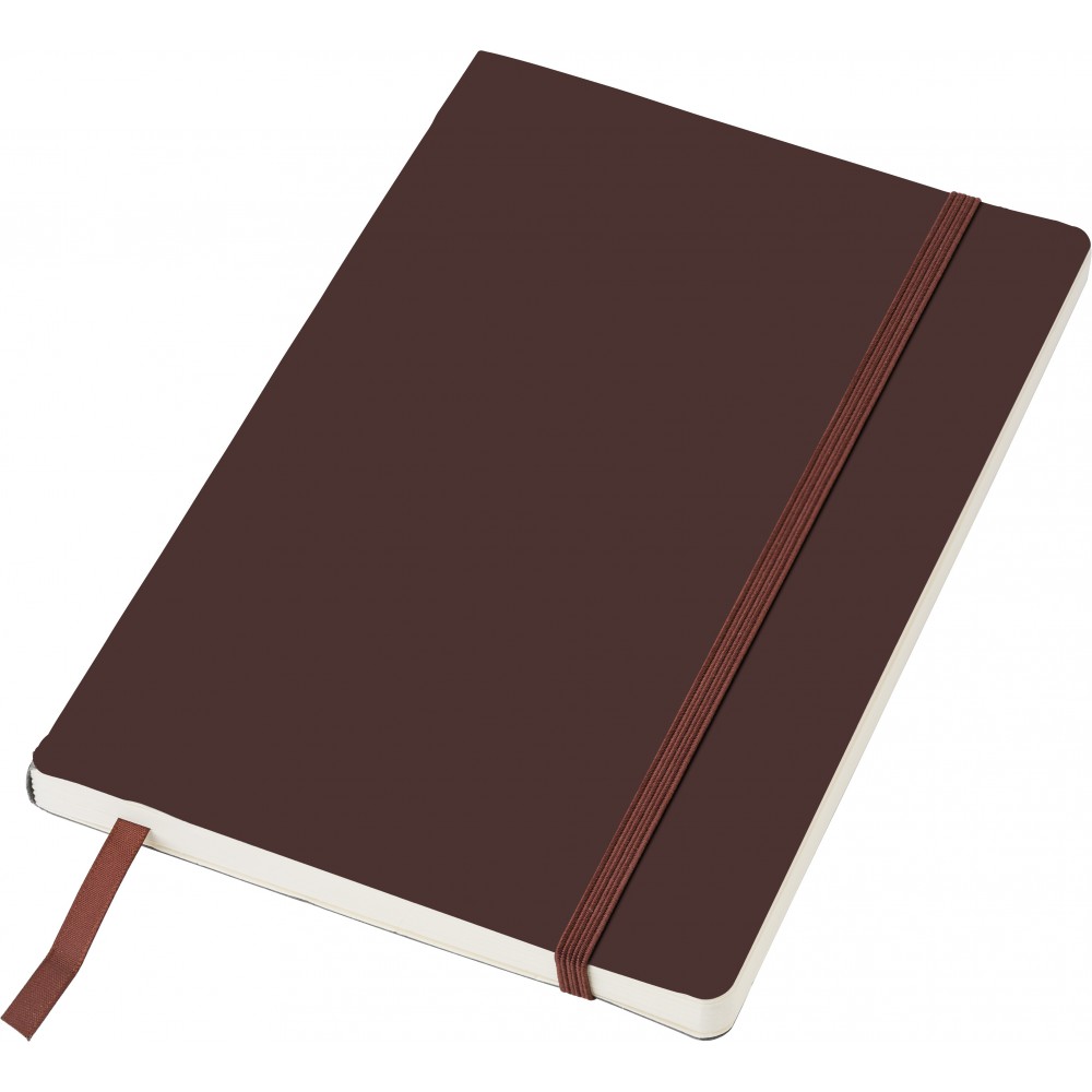 Puhafedelű, hajlékony borítójú füzet 80 vonalas lappal, a borító belsejében zsebbel, gumis záródással és könyvjelzővel. PU.
