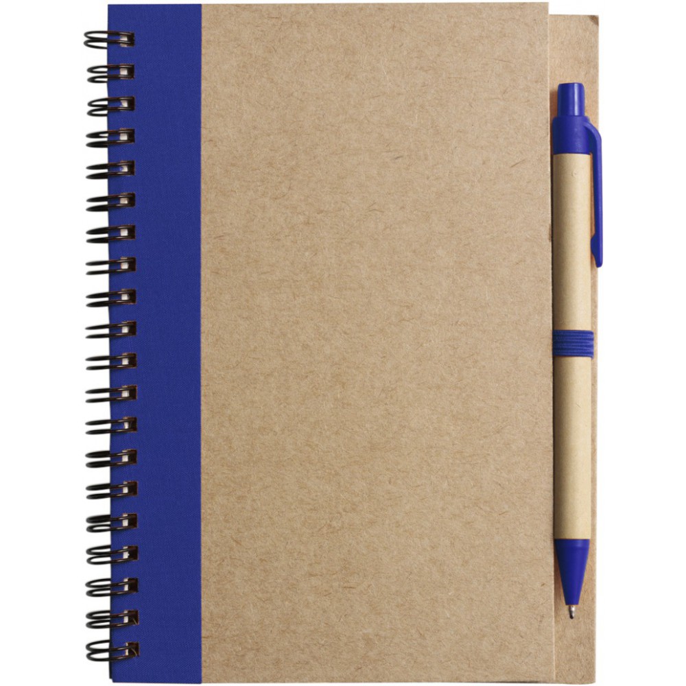 Újrahasznosított papírból készült spirálfüzet 60 vonalas lappal és golyóstoll biológiailag lebomló részekkel, kék tollbetéttel.