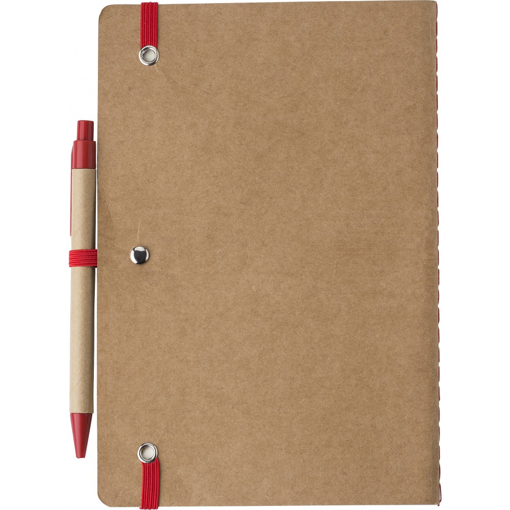 Újrahasznosított karton jegyzetfüzet 60 sima lappal. Tartalmazza a hozzáillő karton/szalma tollat kék tollbetéttel. Gumis összefogó pánt és tollhurok.