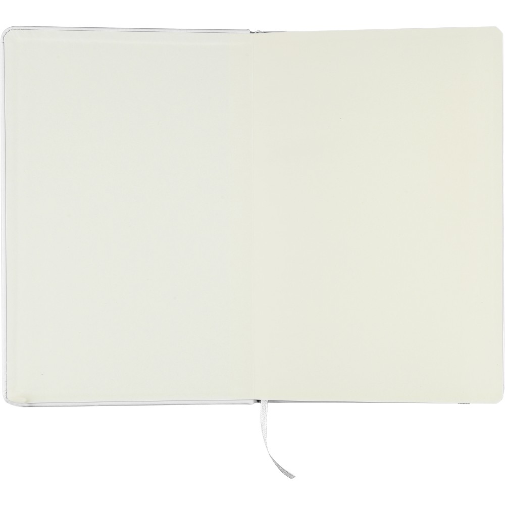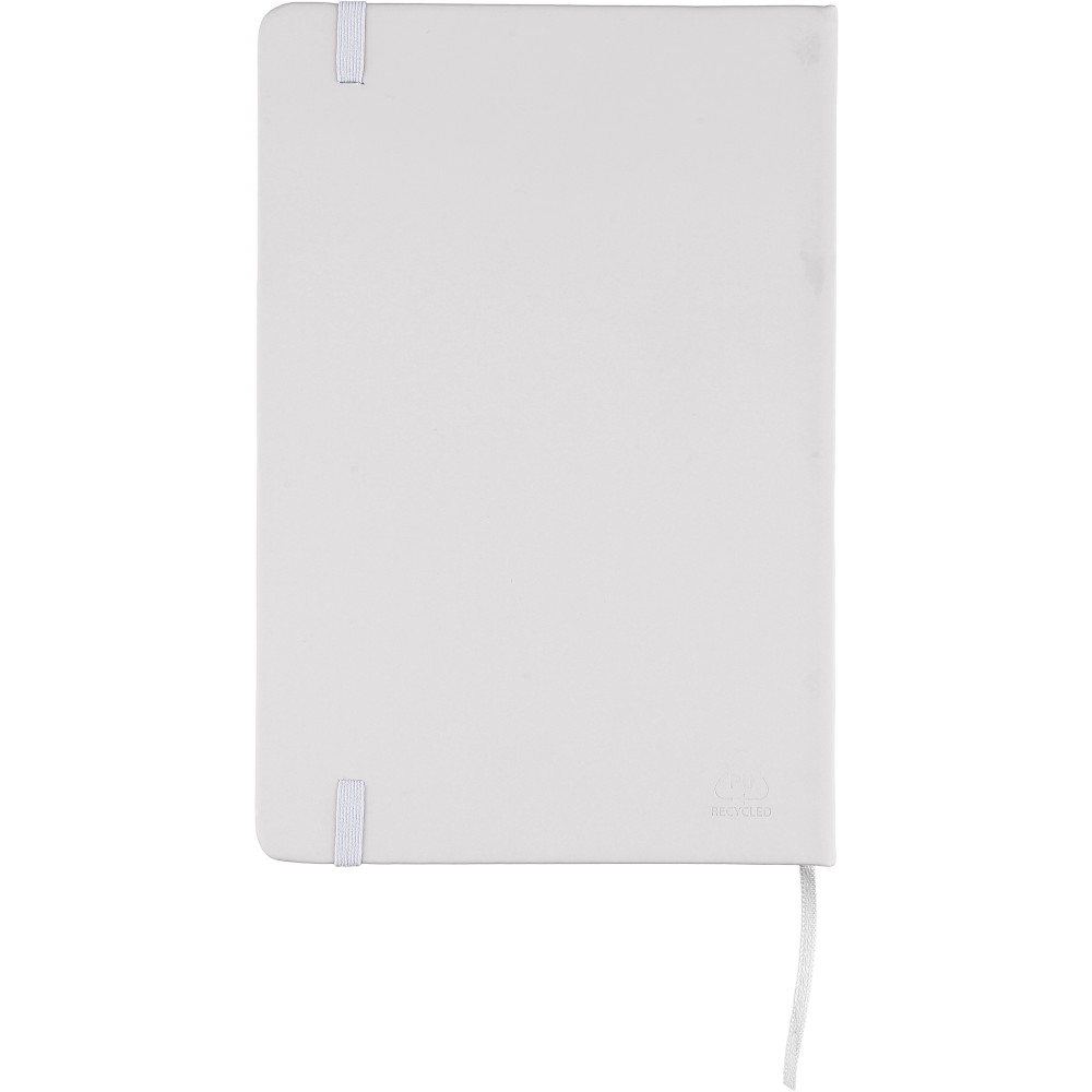 A5-ös méretű jegyzetfüzet rPET PU anyagból készült kemény borítóval, 80 vonalas lappal (70g/m2), színben illeszkedő gumipánttal és könyvjelző szalaggal. Az újrahasznosított anyagra utaló dombornyomott logóval a füzet hátoldalán.