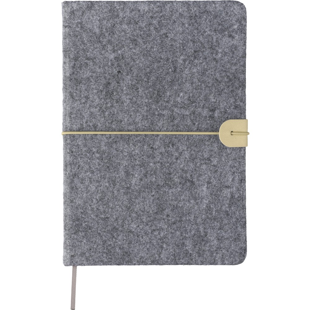 Újrahasznosított filcből készült jegyzetfüzet, kb. A5-ös méretű, 80 lapos. Puha tapintású kemény borítóval, gumiszalaggal és kívül PU zárópánttal. Szalagos könyvjelzővel és 70 g/m2-es vonalas papírral. A hátoldalán lézergravírozott újrahasznosított logóval.