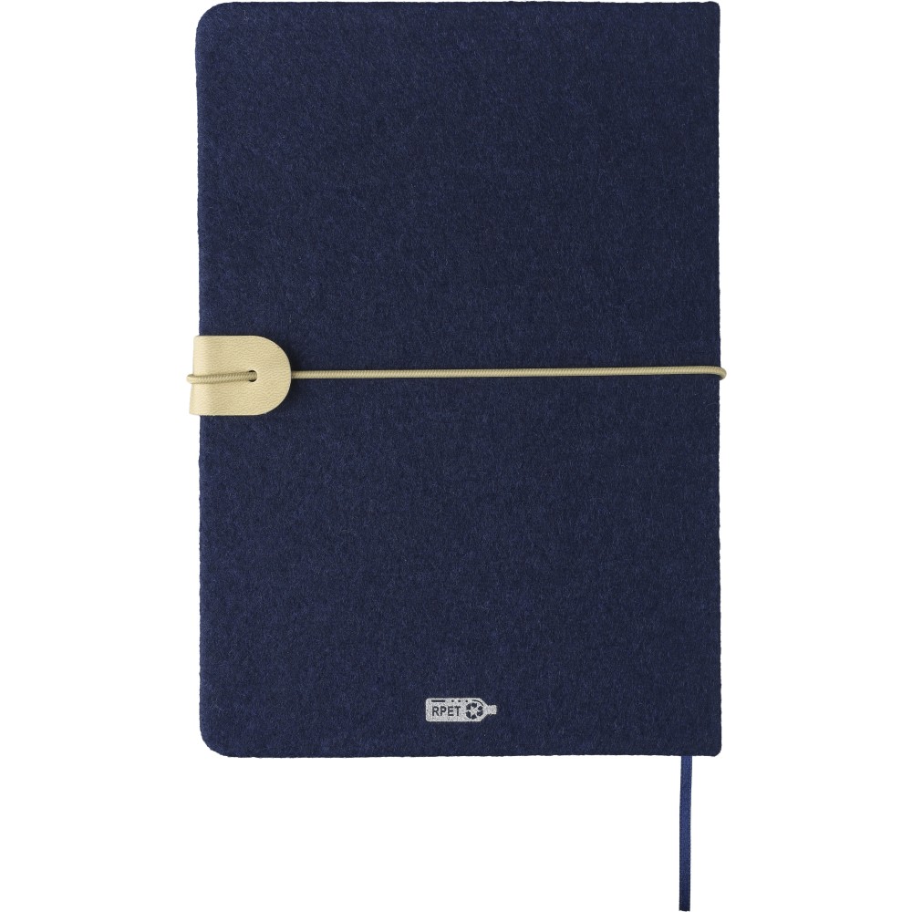Újrahasznosított filcből készült jegyzetfüzet, kb. A5-ös méretű, 80 lapos. Puha tapintású kemény borítóval, gumiszalaggal és kívül PU zárópánttal. Szalagos könyvjelzővel és 70 g/m2-es vonalas papírral. A hátoldalán lézergravírozott újrahasznosított logóval.