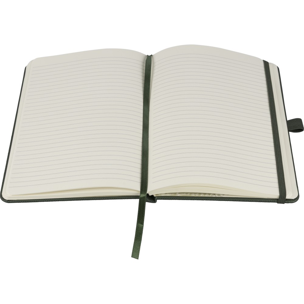 RPET 600D poliészterből készült, PU bevonatú, A5-ös jegyzetfüzet. 80 lap, 70 g/m2 vonalas papír, könyvjelző szalaggal, gumipánttal és tolltartó hurokkal. Félkemény borítású kialakítás. A hátoldalon dombornyomott recycled (újrahasznosított) alapanyagra utaló logó található.