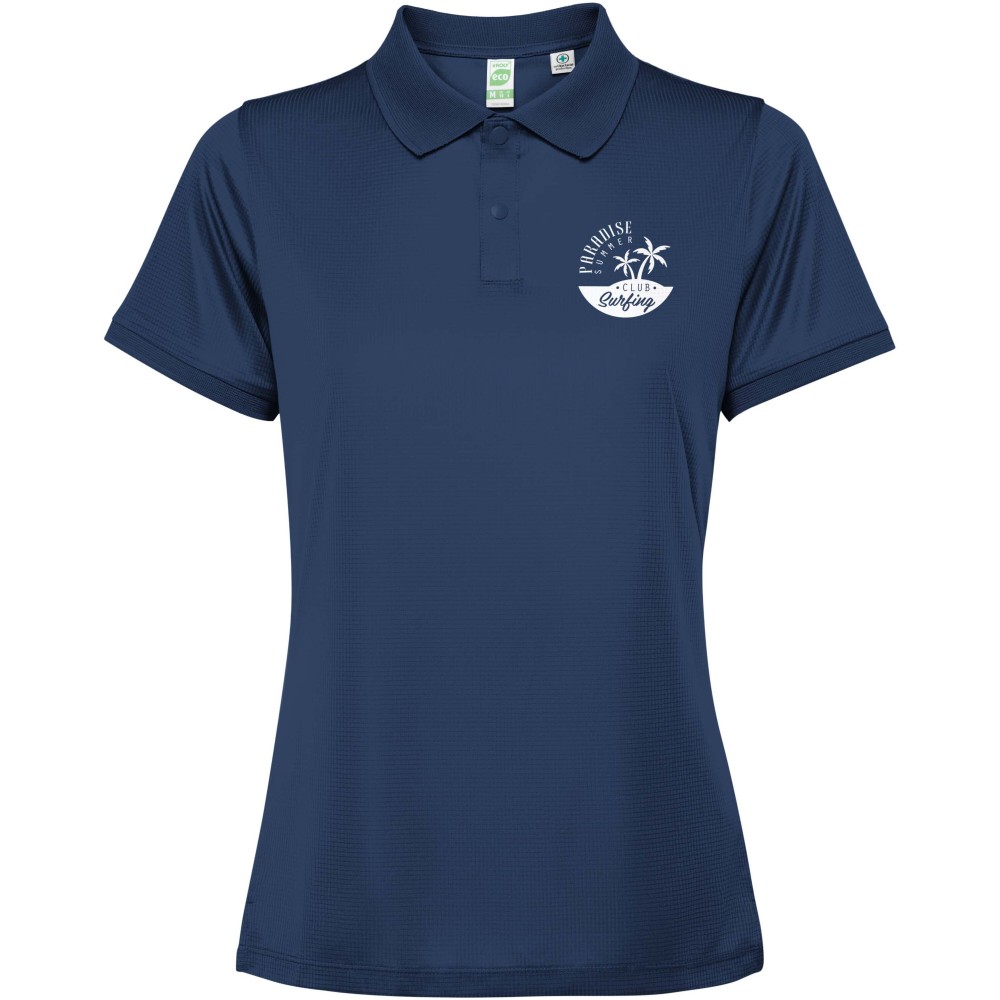 Rövidujjú galléros női póló. Erősített, fedett varrások a belső gallérban. 1x1 bordázott kézelő és gallér. Oldalsó varrások. 3 gombos nyakrész és oldalsliccek. 120g/m2.