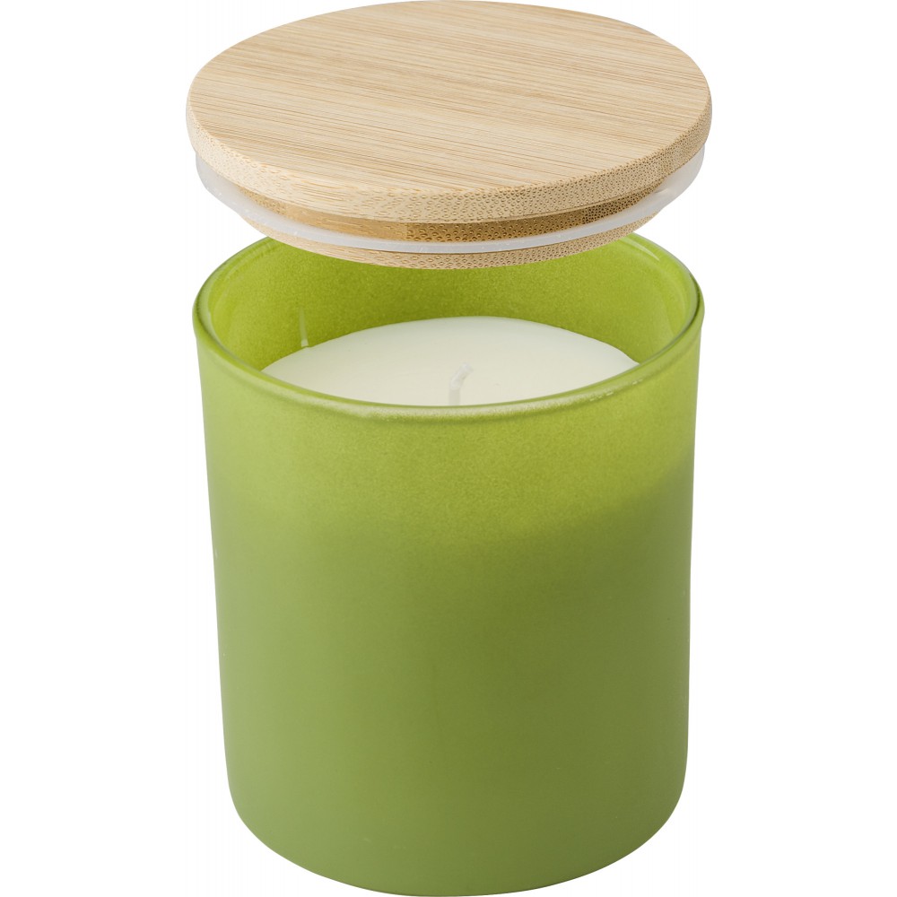 Üveggyertya növényi alapú viasszal és bambusz fedővel. A gyertya főleg növényi viaszt (karnaubaviaszt) tartalmaz, égési ideje körülbelül 33 óra. Négy illat az üveg színétől függően: fahéj (piros), vanília (fehér), szantálfa (fekete) és jázmin (zöld). Egyenként, fehér papírpalástba csomagolva.