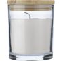 Üveg gyertyatartó 120 g vanília illatú, színes viasszal és bambusz fedéllel. Kb. 20 óra égési idővel. Csomagolása fehér papírhenger.