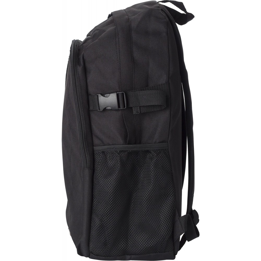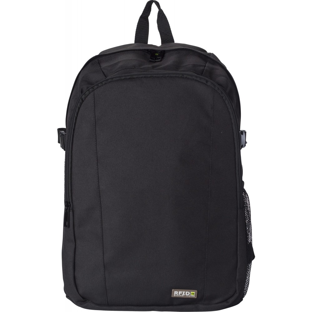 Hátizsák RFID blokkolóval. Az első zseb és a fő rekesz cipzáras. Belül több zseb biztosítja a kényelmes használhatóságot. Oldalhálós külső zseb. A pántok párnázottak és állíthatóak. 600D poliészter.