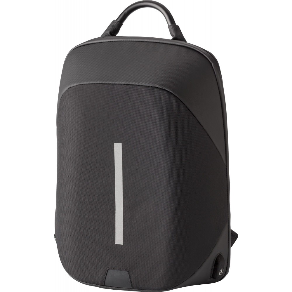 Hátizsák több belső zsebbel, párnázott rész a 15"-es laptop számára, párnázott, állítható vállpánt. 3 karakteres számkonbinációs lakat, fém fül, USB port és vezeték, fényvisszaverő csík, könnyített súlyeloszlást biztosító kialakítás. 1200D nylon anyag.