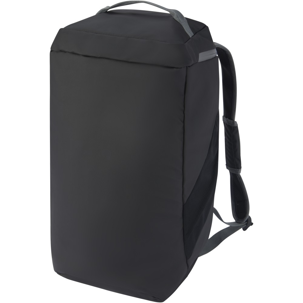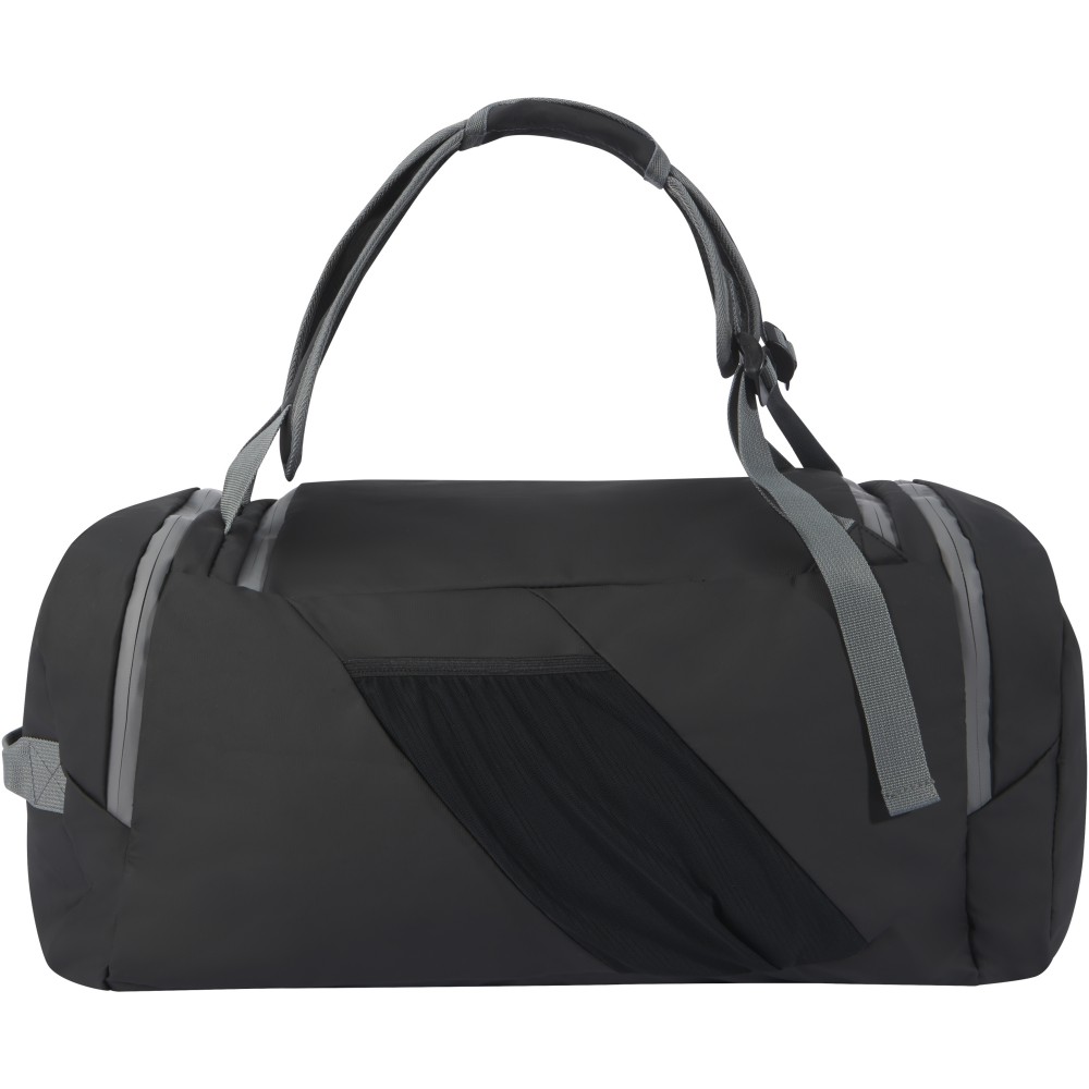 Vízálló 2 az 1-ben sporttáska és hátizsák GRS tanúsítvánnyal rendelkező újrahasznosított anyagokból, beleértve a cipzárakat is. Tágas főrekesszel rendelkezik, U alakú nyílással a könnyű tárolás és hozzáférés érdekében, két cipzáras oldalzsebbel (köztük egy cipőrekesszel), egy cipzáras elülső zsebbel, egy hálós vízzsebbel a hátoldalon, valamint fényvisszaverő csíkokkal a láthatóság érdekében. Ez a táska 3 különböző módon hordható: kézben, vállon átvetve vagy hátizsákként a párnázott és állítható vállpántok segítségével. A GRS újrahasznosított anyagai közé tartozik a főszövet, a bélés, a hevederek és a cipzárak. Űrtartalom: 35 liter. PVC-mentes.