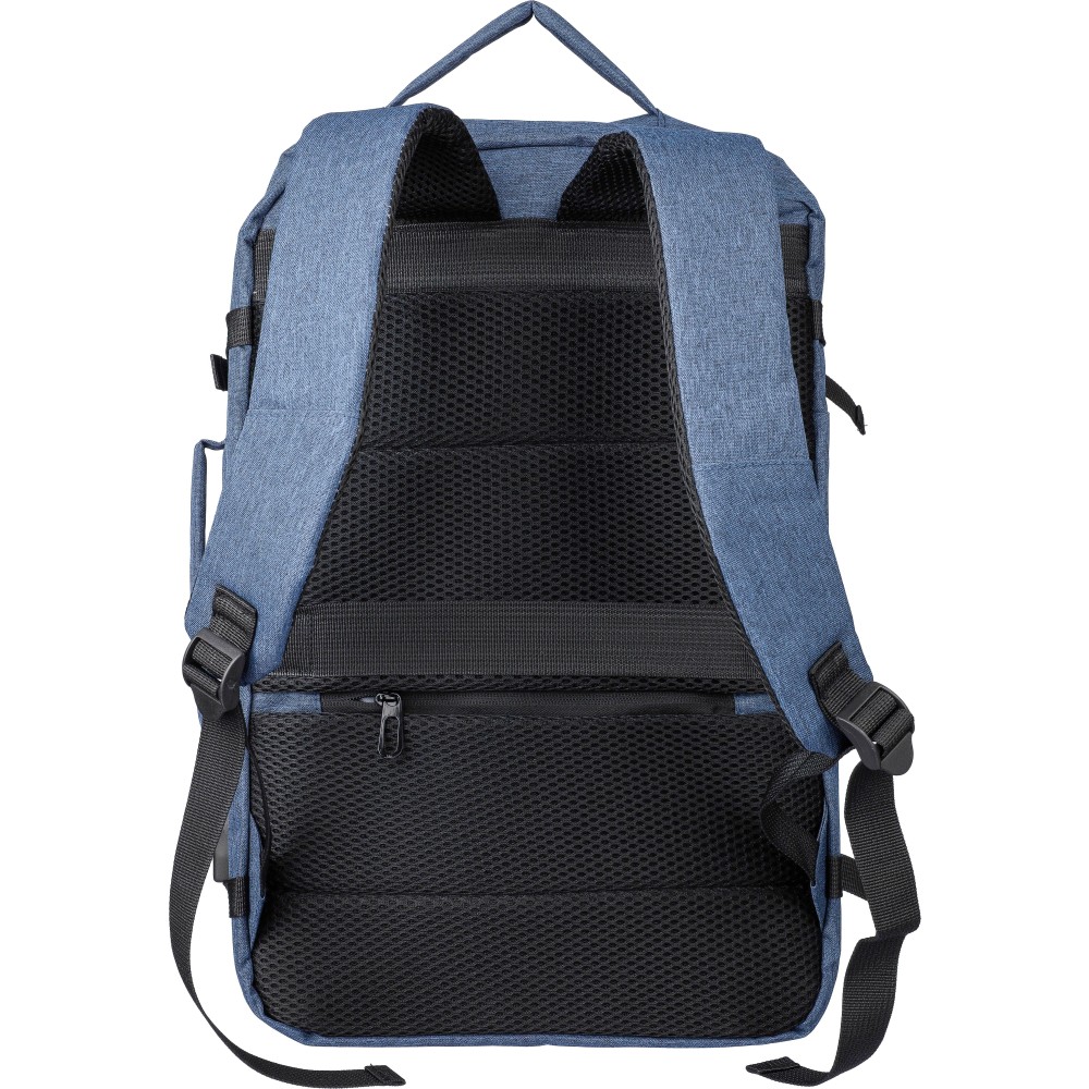 Hátizsák és laptoptáska 17"-es készülékhez. Kézipoggyász méretű. Hordozófüllel a tetején és oldalain. Tépőzáras laptop rekesszel, lopásgátló zsebbel és két nagy cipzáras rekesszel. Szellőző, párnázott hátoldallal, bőröndre húzható pánttal, zárócsatokkal és oldalsó USB-A porttal rendelkezik. Oldalsó csatok segítik a csomag kompakt tartását. Terhelhetősége kb. 12 kg. RPET alapanyagra utaló címke. Anyaga: 300D rPET poliészter.