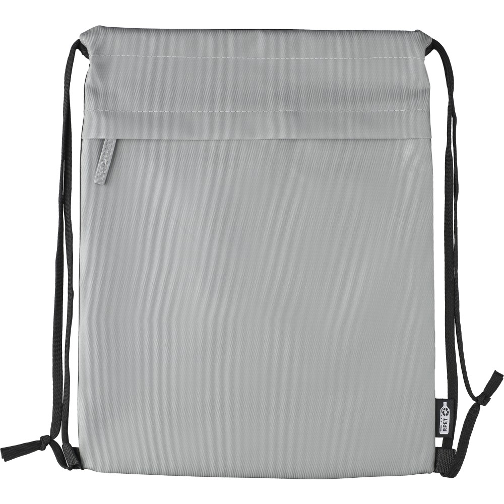 600D rPET poliészter tornazsák. Az elejét PU bevonat teszi vízlepergetővé. Rejtett cipzáras első zsebbel, két tárolórésszel, első és belső zsebekkel. Kapacitása 8 liter, teherbírása 8 kg. Oldalán rPET címkével.
