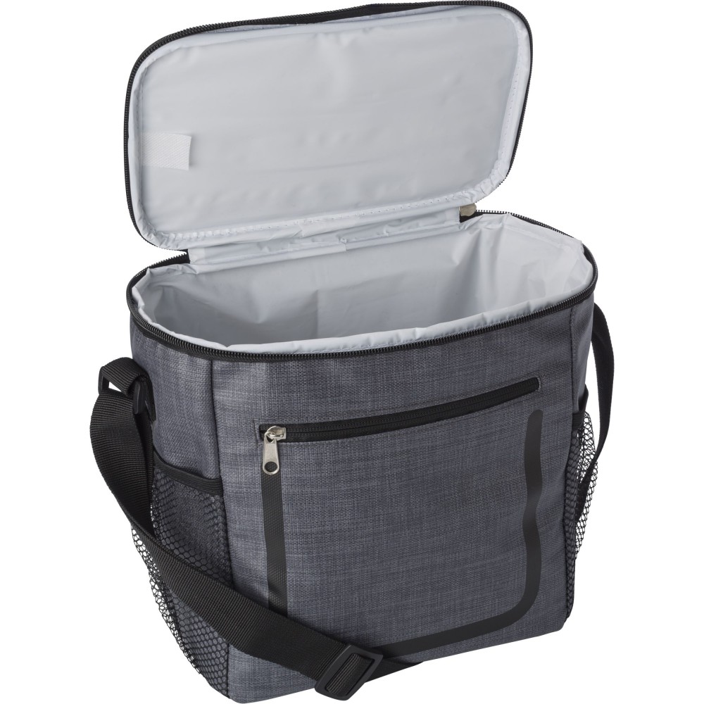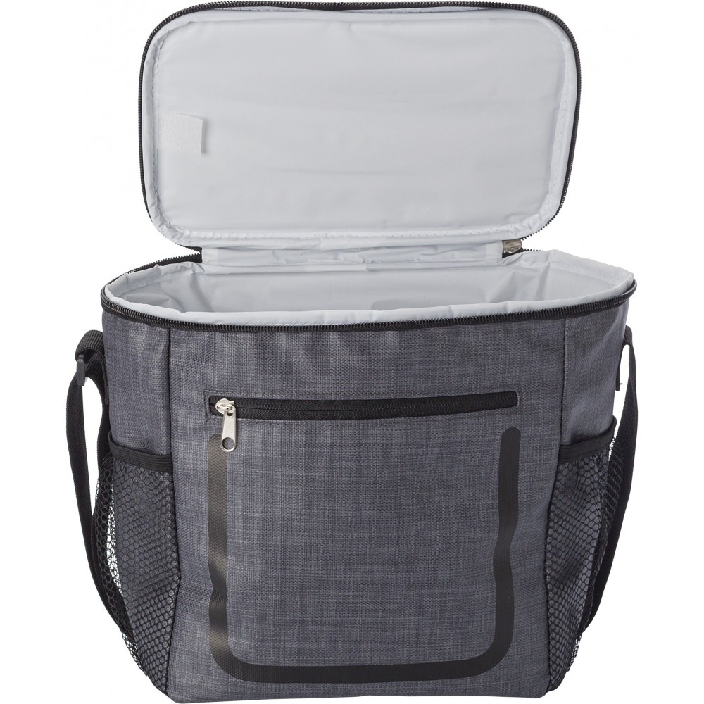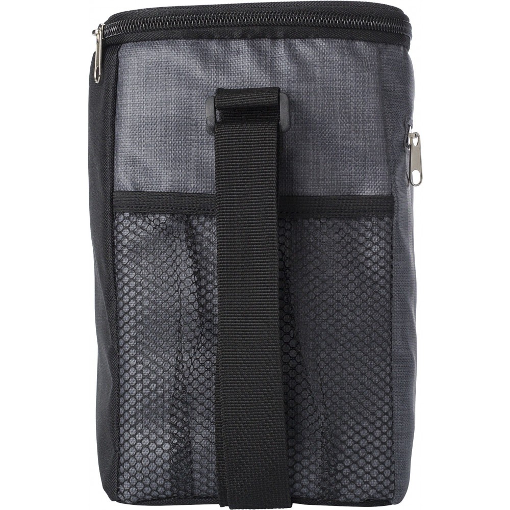 Hűtőtáska cipzáras elsőzsebbel és hálós oldalsó rekeszekkel. A belső rész fehér szigetelő fóliával van bélelve. A táska állítható vállpánttal rendelkezik. PE, PU műanyag.