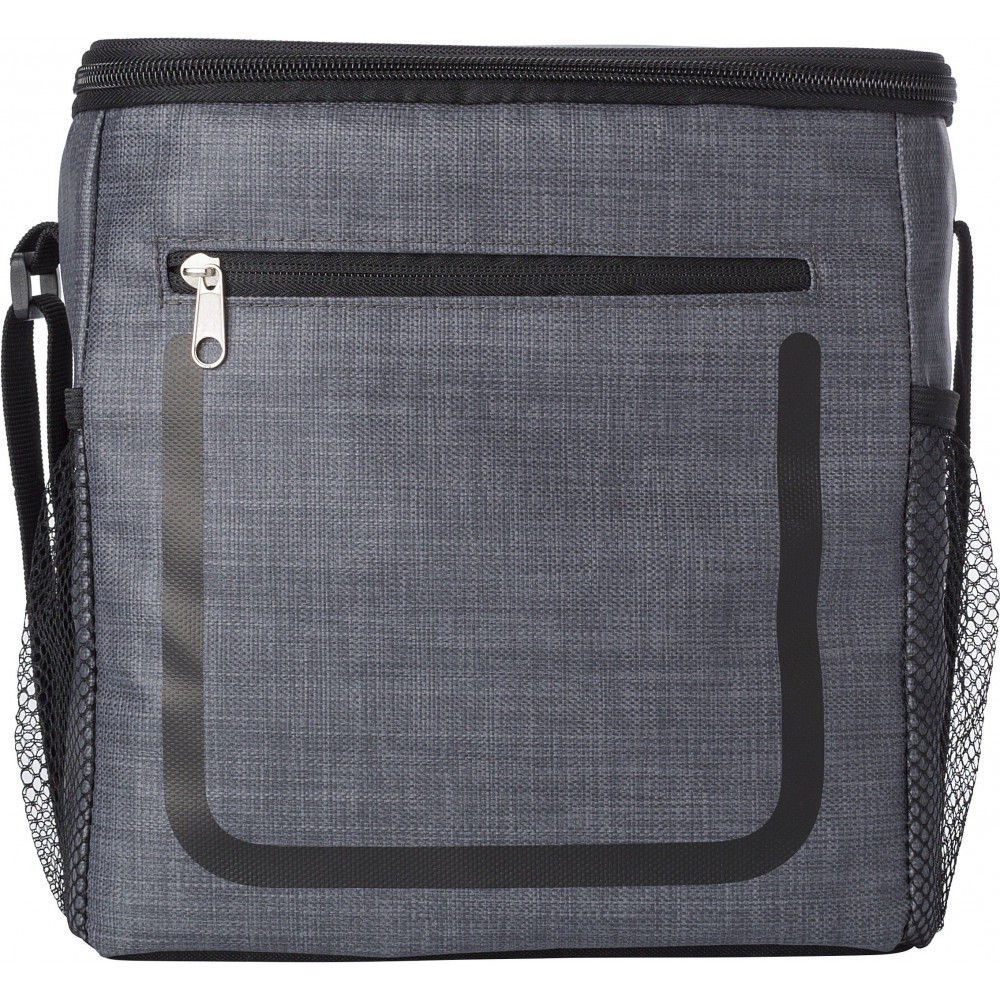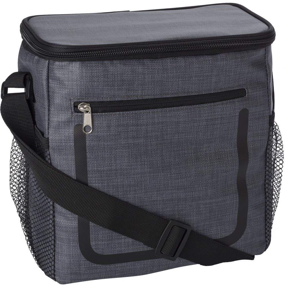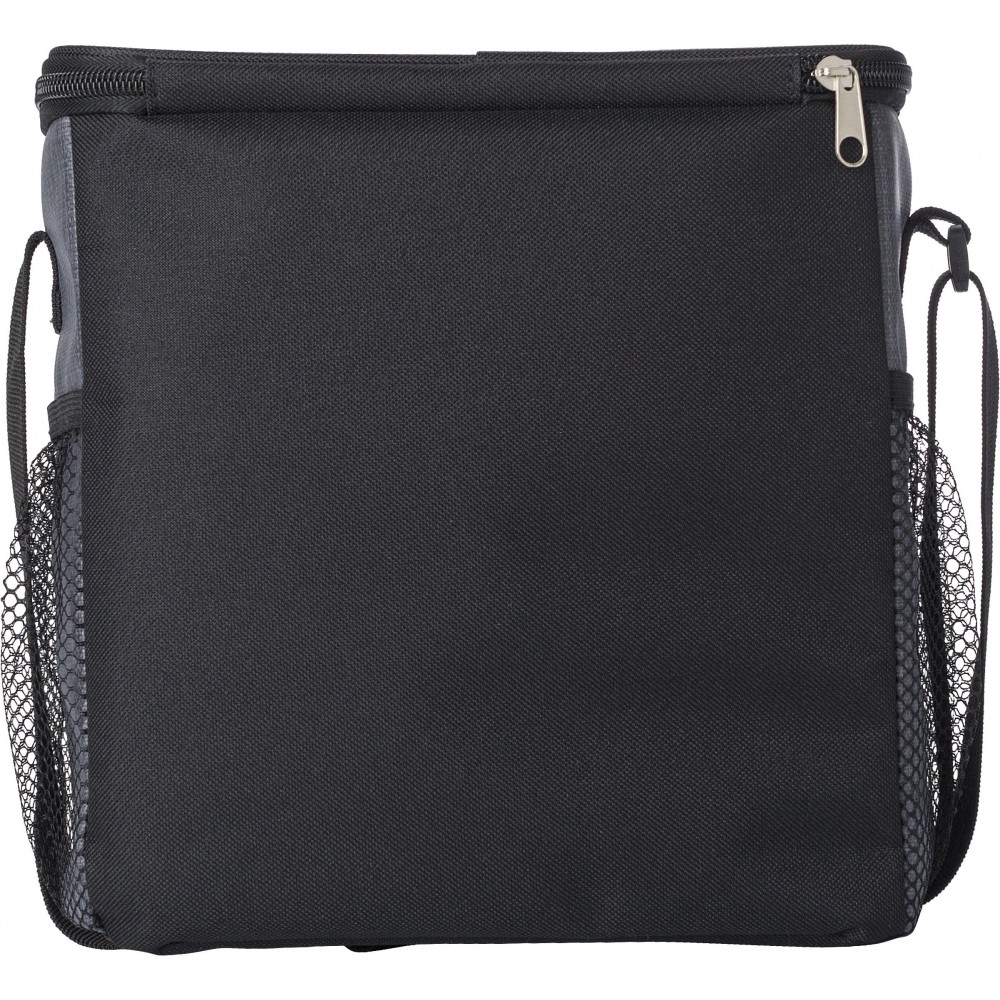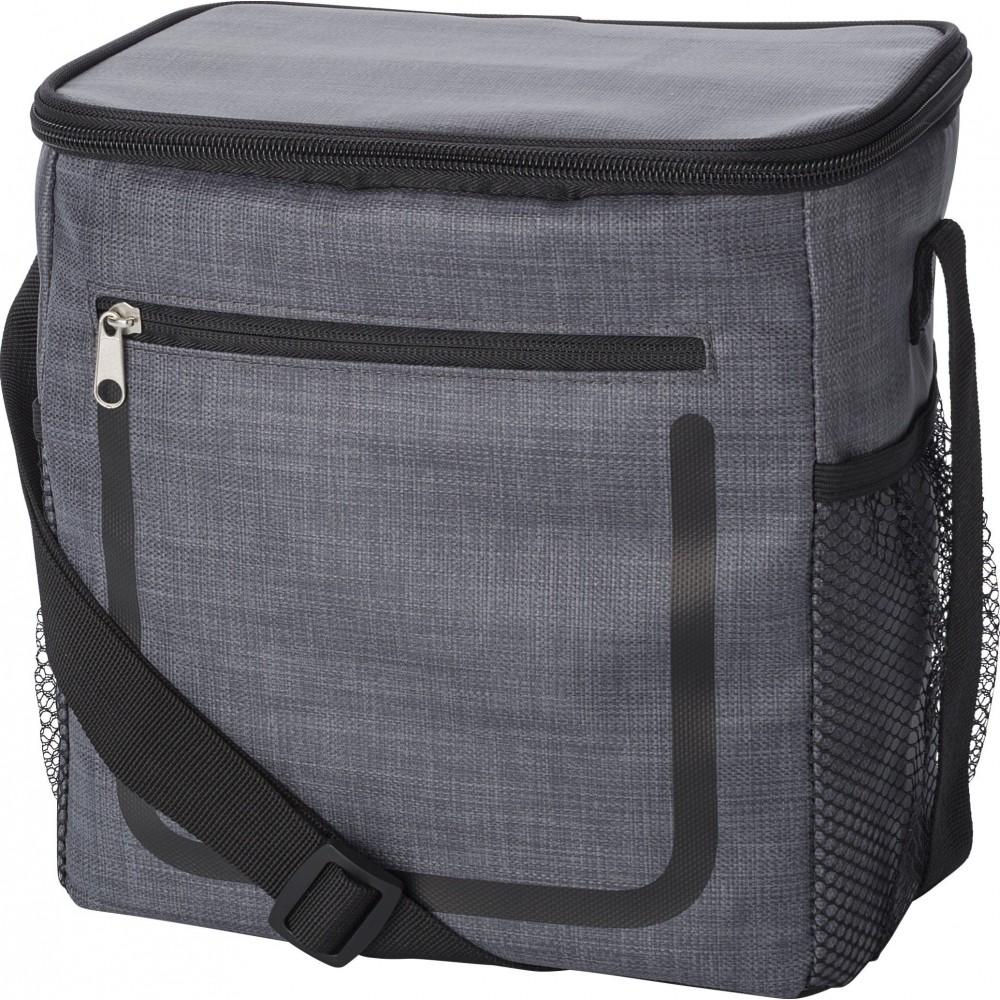 Hűtőtáska cipzáras elsőzsebbel és hálós oldalsó rekeszekkel. A belső rész fehér szigetelő fóliával van bélelve. A táska állítható vállpánttal rendelkezik. PE, PU műanyag.