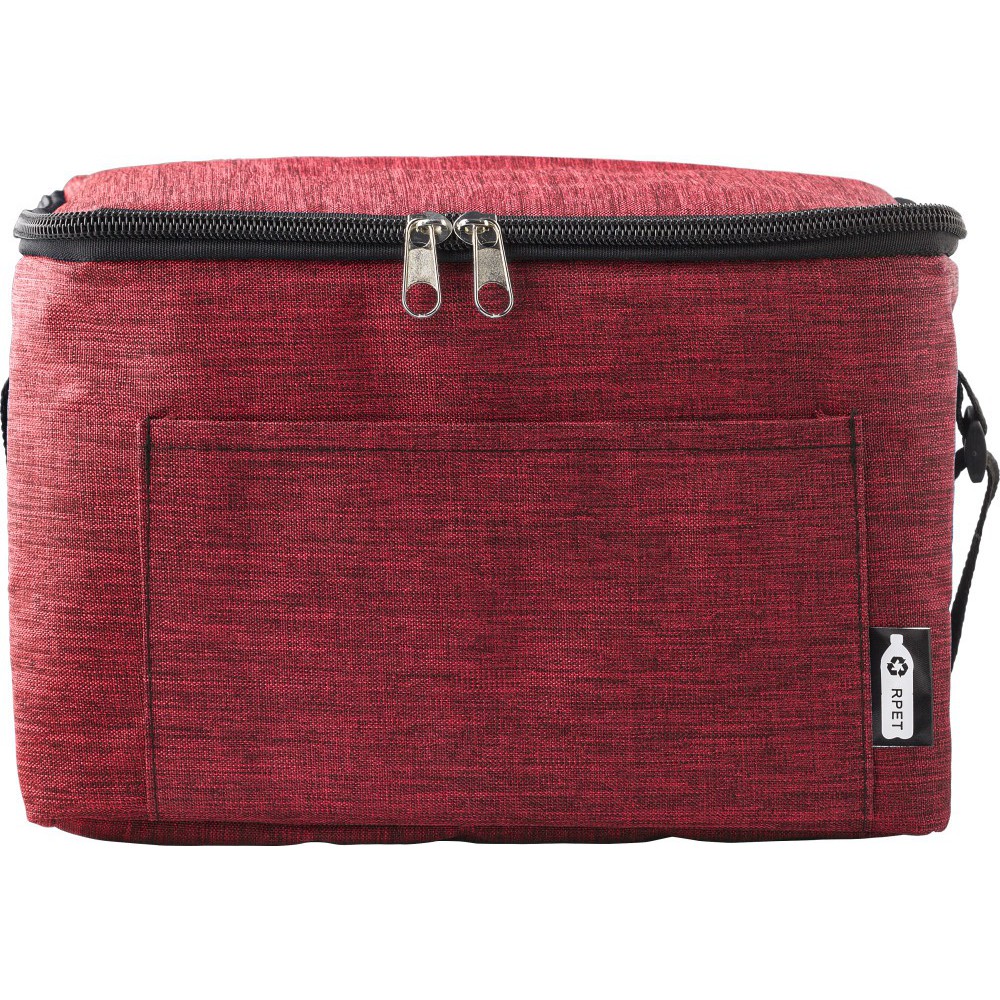 Hűtőtáska hat darab 330 ml-es üdítősdoboz számára. Cipzárral, első zsebbel és állítható pánttal. Űrtartalom: 3 liter. Poliészter (600D) és RPET anyag PEVA belsővel.