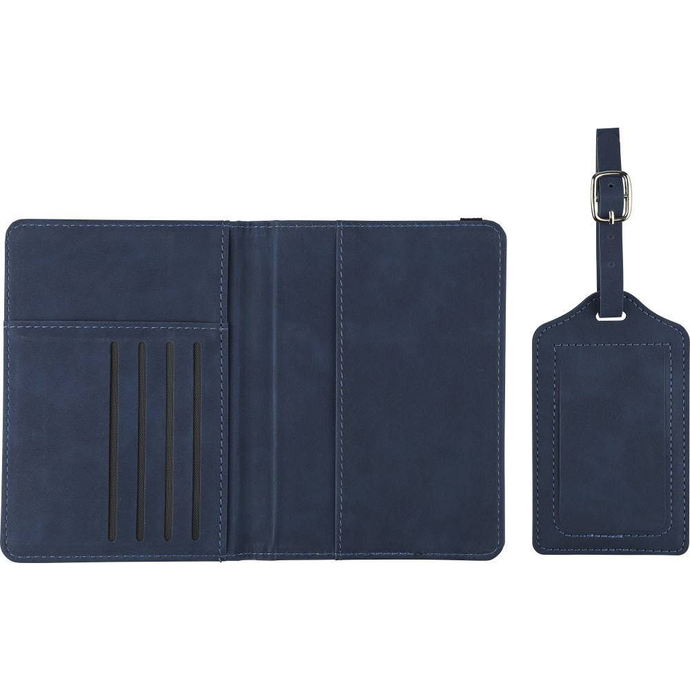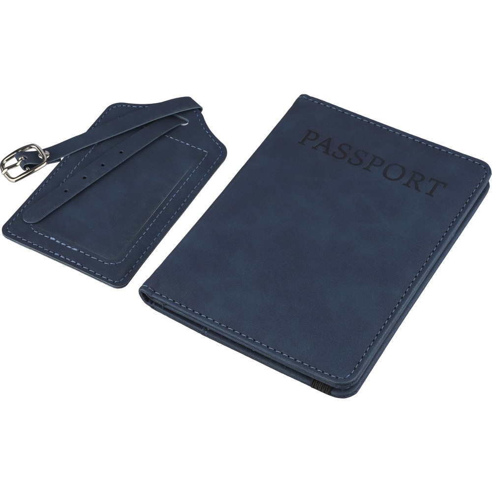 Újrahasznosított PU anyagból készült útlevéltartó és poggyászcímke, illusztrációval ellátott barna kartondobozban. Az útlevéltartó elülső oldalán "Passport" felirat található, belül két rekesszel az útlevél biztonságos rögzítéséhez. Mindkét terméken dombornyomott, újrahasznosított alapanyagra utaló logó található.