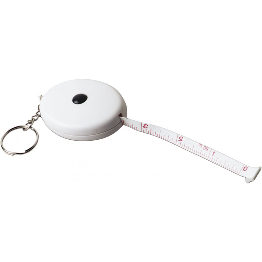 1,5 m-es mérőszalag fekete stop-gombbal, kulcstartóval.