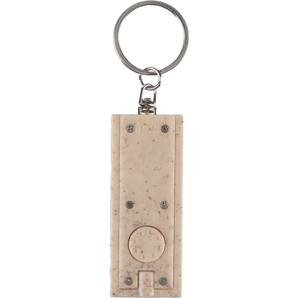 Szalma felhasználásával készült kulcstartó egy LED-es lámpával, fém kulcskarikával és nyomógombbal.