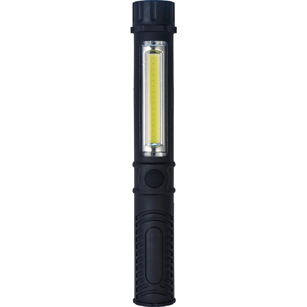 Lámpa COB (chip on board) fényforrással a tetején és az oldalán. Az elemet tartalmazza. Műanyag.