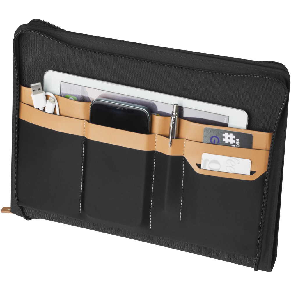 Az RCS tanúsítvánnyal rendelkező Nomumi portfólió részben újrahasznosított poliészterből készül, így ez a portfólió fenntarthatóbb választás, mivel segít csökkenteni az új nyersanyag felhasználást. Cipzáras záródással, tollhurokkal, harmonikazsebbel és 20 fehér vonalas lappal rendelkezik, amelyek 70 g/m2 -es, fenntartható forrásból származó, újrahasznosított papírból készültek. A képeken látható toll és egyéb kiegészítők nem tartoznak a termékhez.