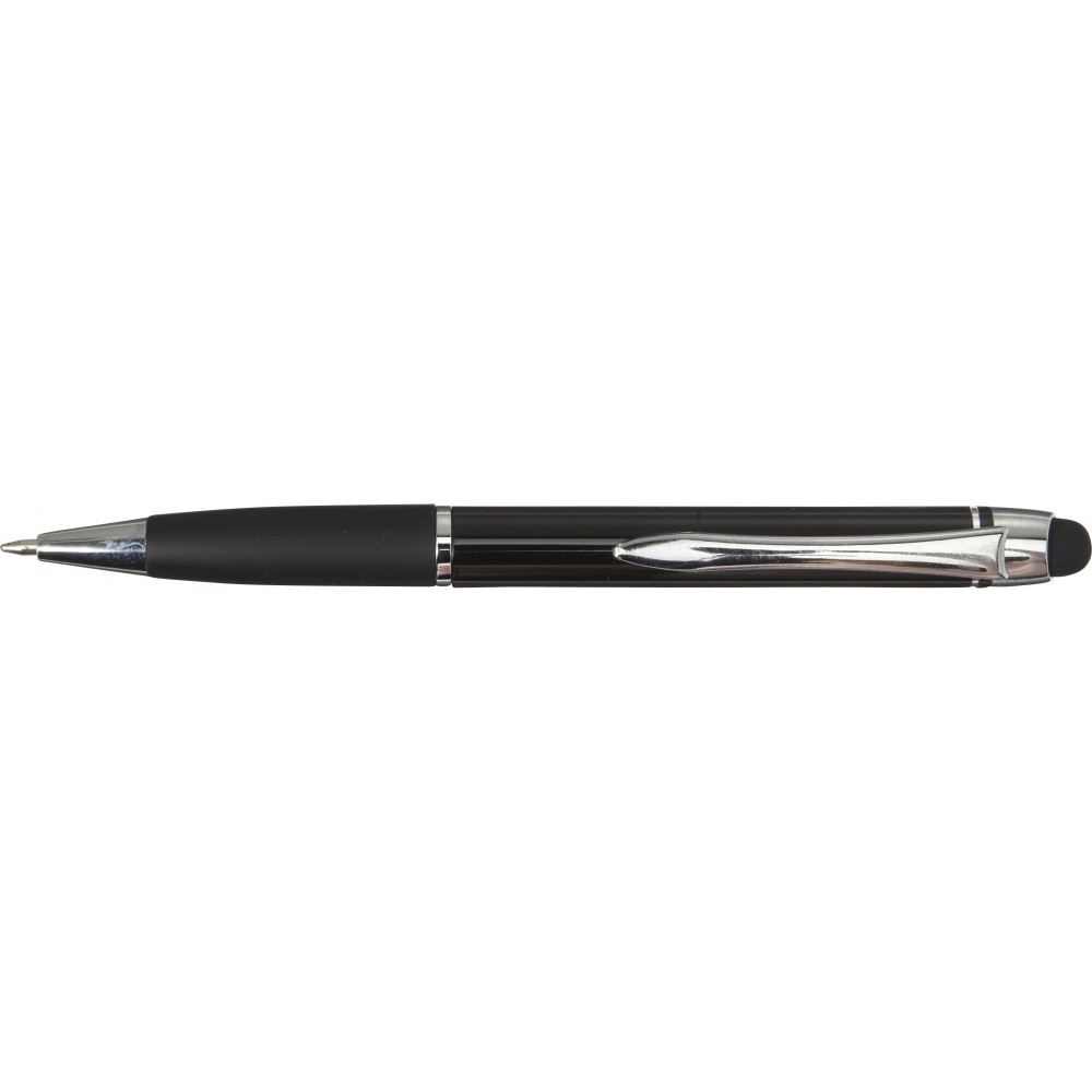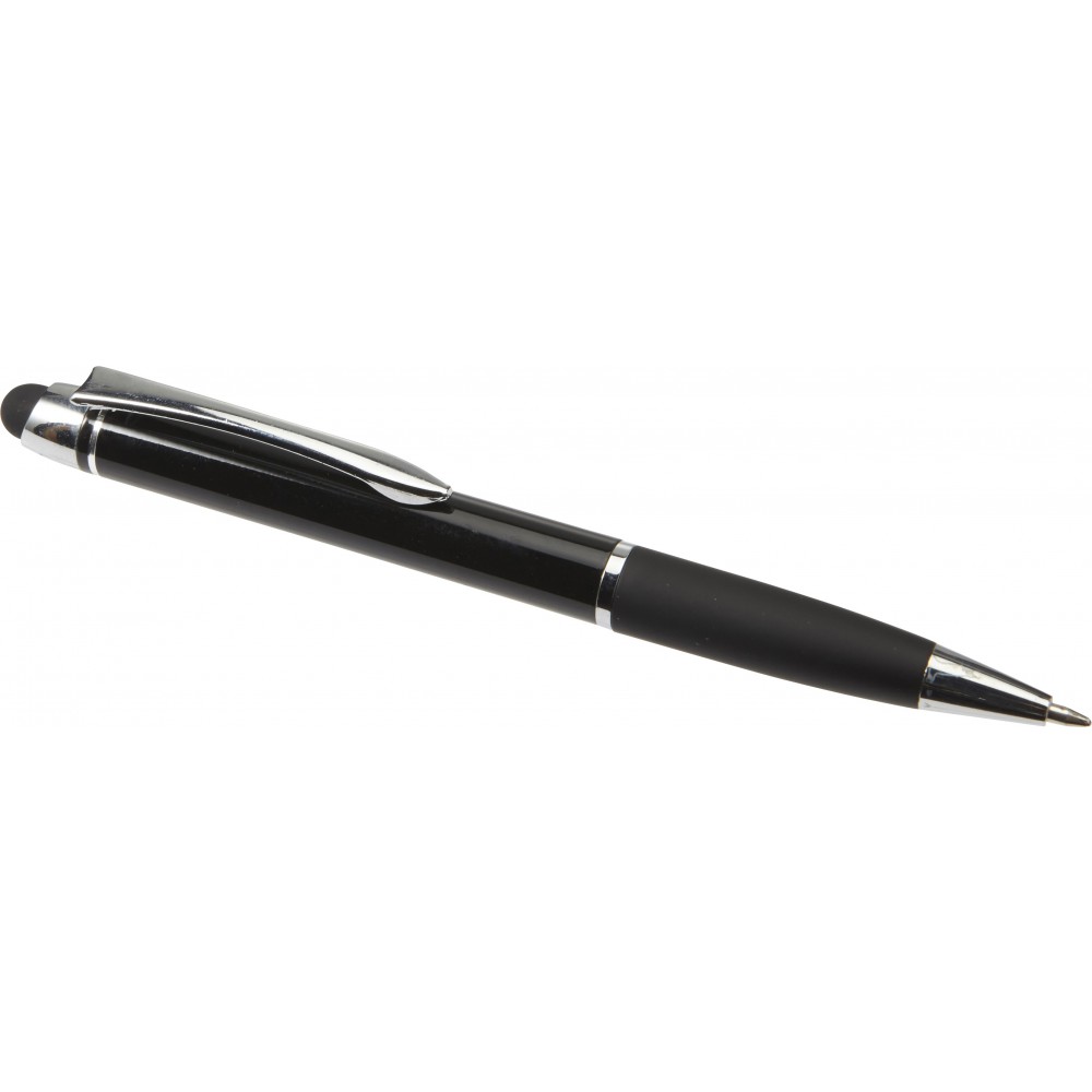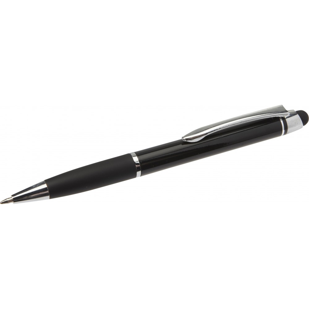 Golyóstoll érintővel, fényes felülettel, színben illeszkedő gumis fogórésszel, fényes ezüst kiegészítőkkel, fekete tollbetéttel. Alumínium.