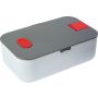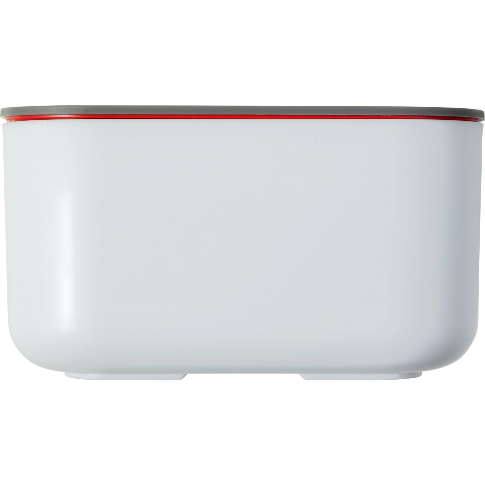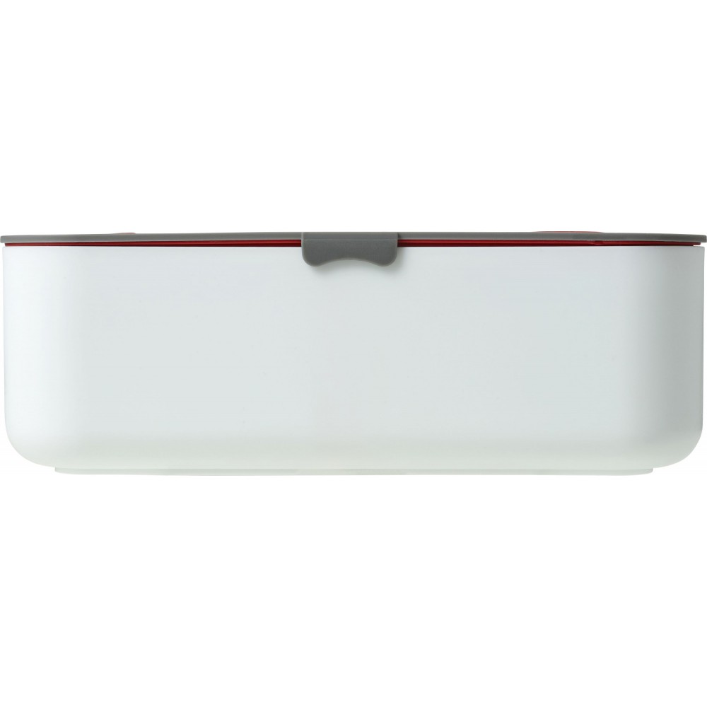 Ételdoboz egy belső elválasztóval. A fedélen lévő zárószerkezet telefontartóként is használható. Fedél nélkül mikrózható, csak a doboz. Űrtartalom: 850 ml. PP BPA-mentes műanyag.