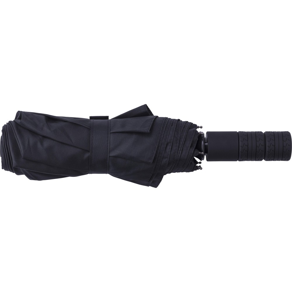 Automata nyitású és zárású, összecsukható esernyő 8 panellel, tokkal. Nyele gumis mintázatú, az autók abroncsára emlékeztet. Vászna RPET pongee anyag. Mérete: 21".