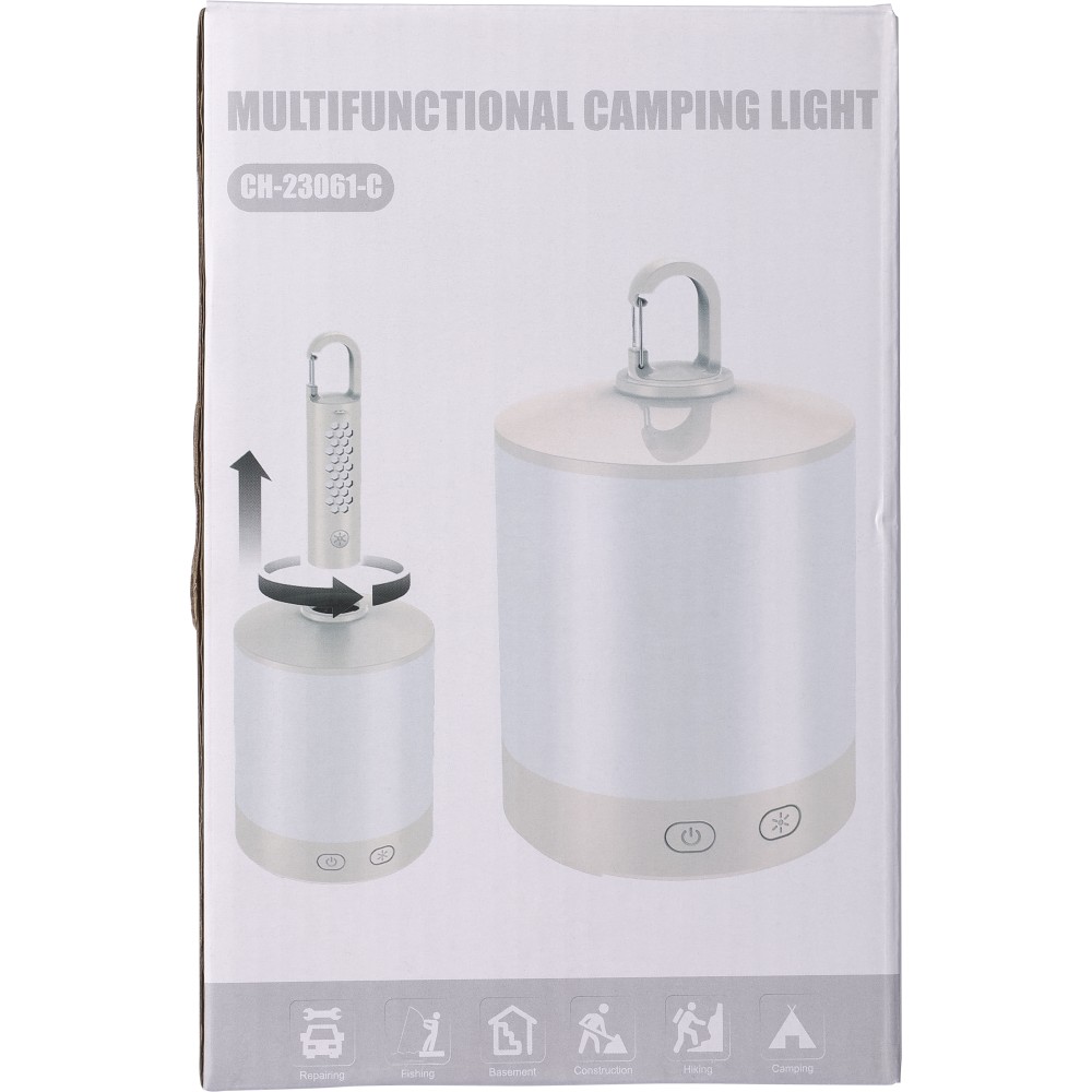 Multifunkciós lámpa kempingezéshez. Levehető elemlámpával, karabinerrel, 4 világítási móddal. 8-féle színben világít, melyek közül a fehér kétféleképpen is működtethető. A másik 7 szín váltakozóra is beállítható a gomb nyomvatartásával. Az elemlámpa 800 mAh-s, a kempinglámpa 2400 mAh-s akkumulátorral rendelkezik. C-típusú csatlakozók. Csomagolása papírdoboz.