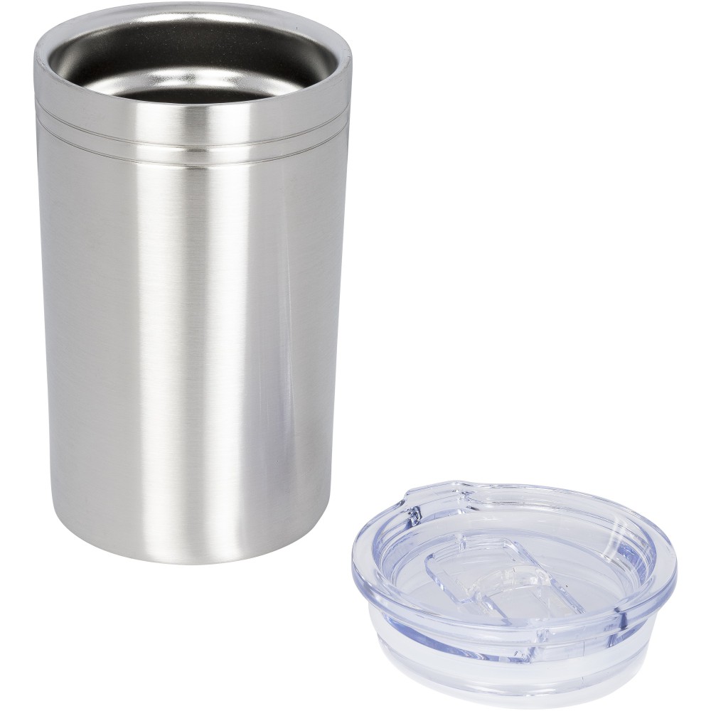 Duplafalas, vákuumos kialakítás. Nem szivárgásmentes. Szénsavas italokkal nem használható. Mosogatógépben nem mosható és mikrohullámú sütőben történő melegítésre nem alkalmas. Átlátszó, rápattintható kupak, elcsúsztatható záródással. Űrtartalom: 330 ml.