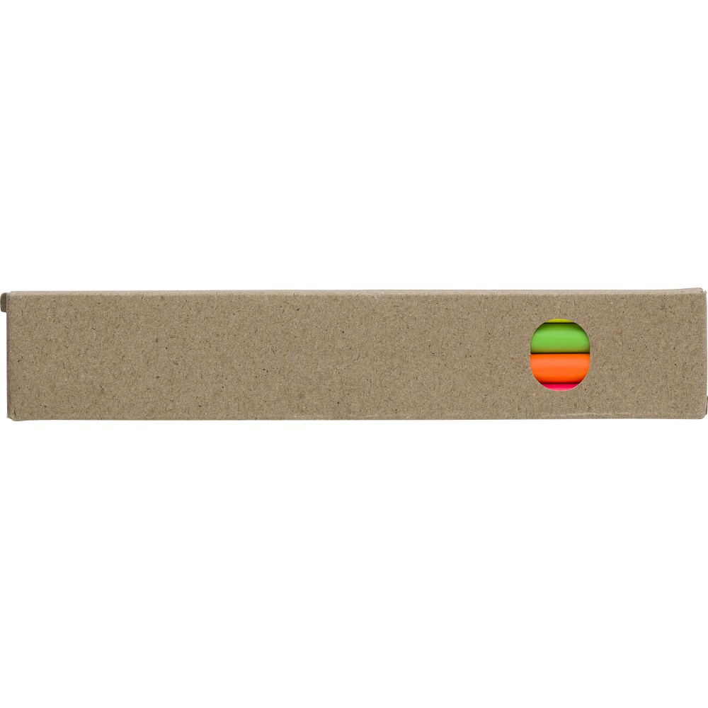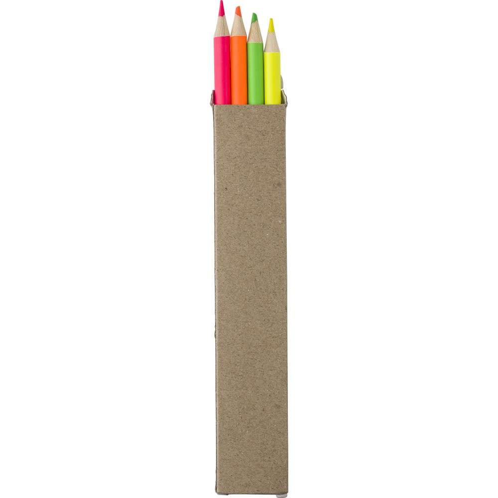Fa szövegkiemelő ceruzakészlet 4 színes ceruzával (sárga, narancs, rózsaszín és zöld) papírdobozban.