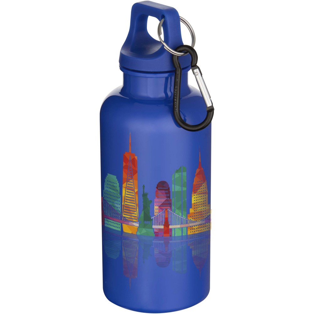Az RCS tanúsítvánnyal rendelkező RPET-ből készült, tartós, mégis könnyű, 400 ml-es kulacs lehetővé teszi a folyamatos hidratálást. Tökéletes kísérő sportoláshoz, kirándulásokhoz vagy irodai használatra. A szimplafalú Oregon palack csavaros kupakkal rendelkezik, és bőséges felületet kínál bármilyen logó elhelyezésére. A mellékelt karabiner segítségével (mely mászásra nem alkalmas) a kulacs biztonságosan táskához rögzíthető. A termék megfelel az EFSA által jóváhagyott PET újrahasznosítási szabályoknak.