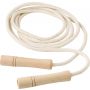 Ugrálókötél fa fogóval, pamut és poliészter kevertszálas kötéllel. A kötél hossza: 2.5 méter. Csomagolása pamut tasak.