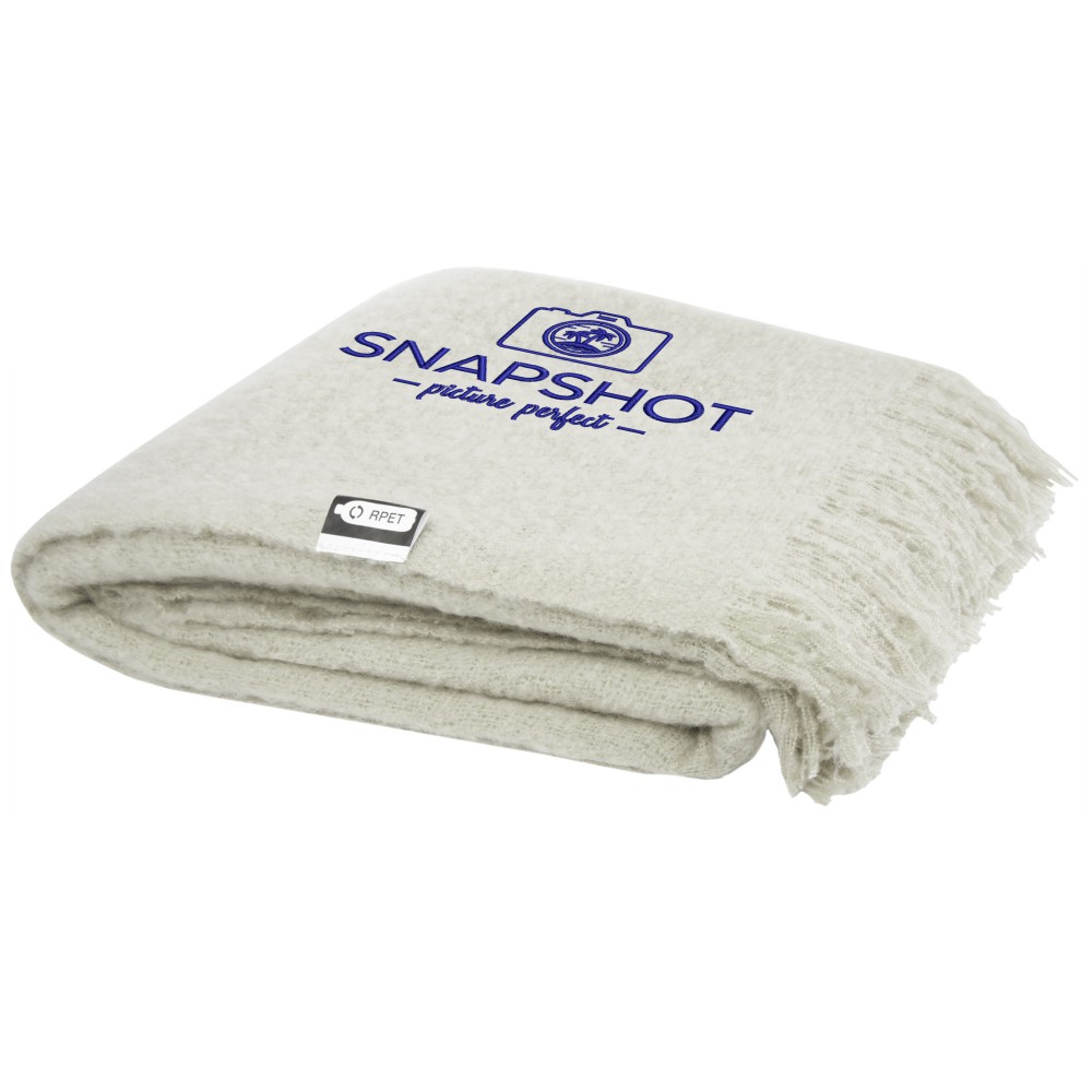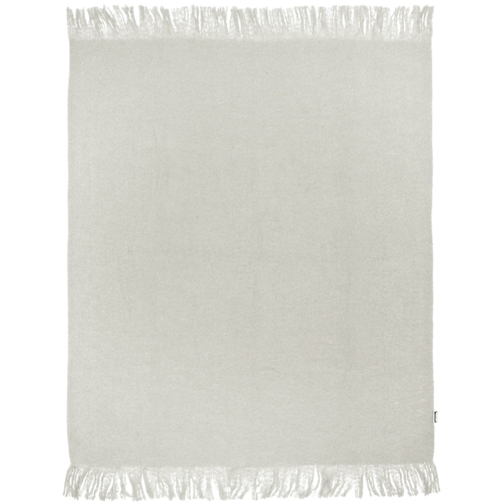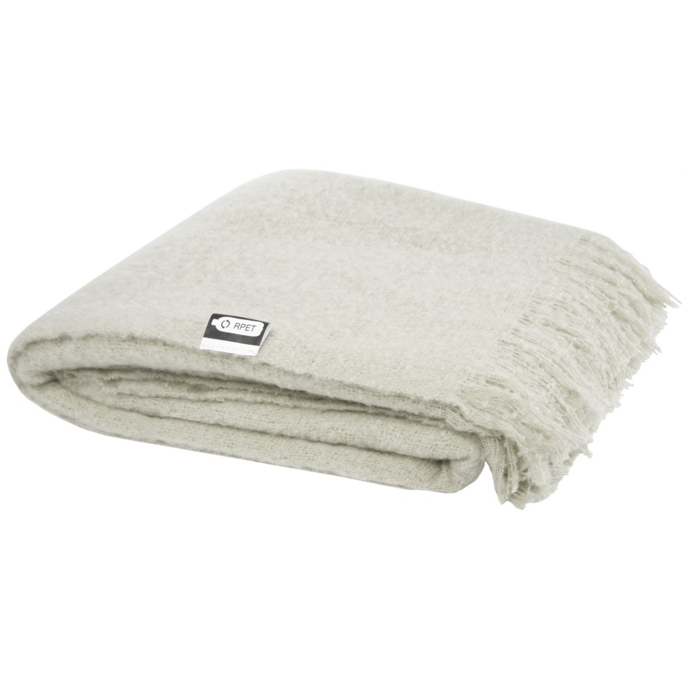 Ultrapuha újrahasznosított PET-ből készült moher takaró összefogó pánttal. A rojtok hossza: 10 cm mindkét végén. Összefogó szalag mérete: 72 x 4 cm. 215 g/m2.
