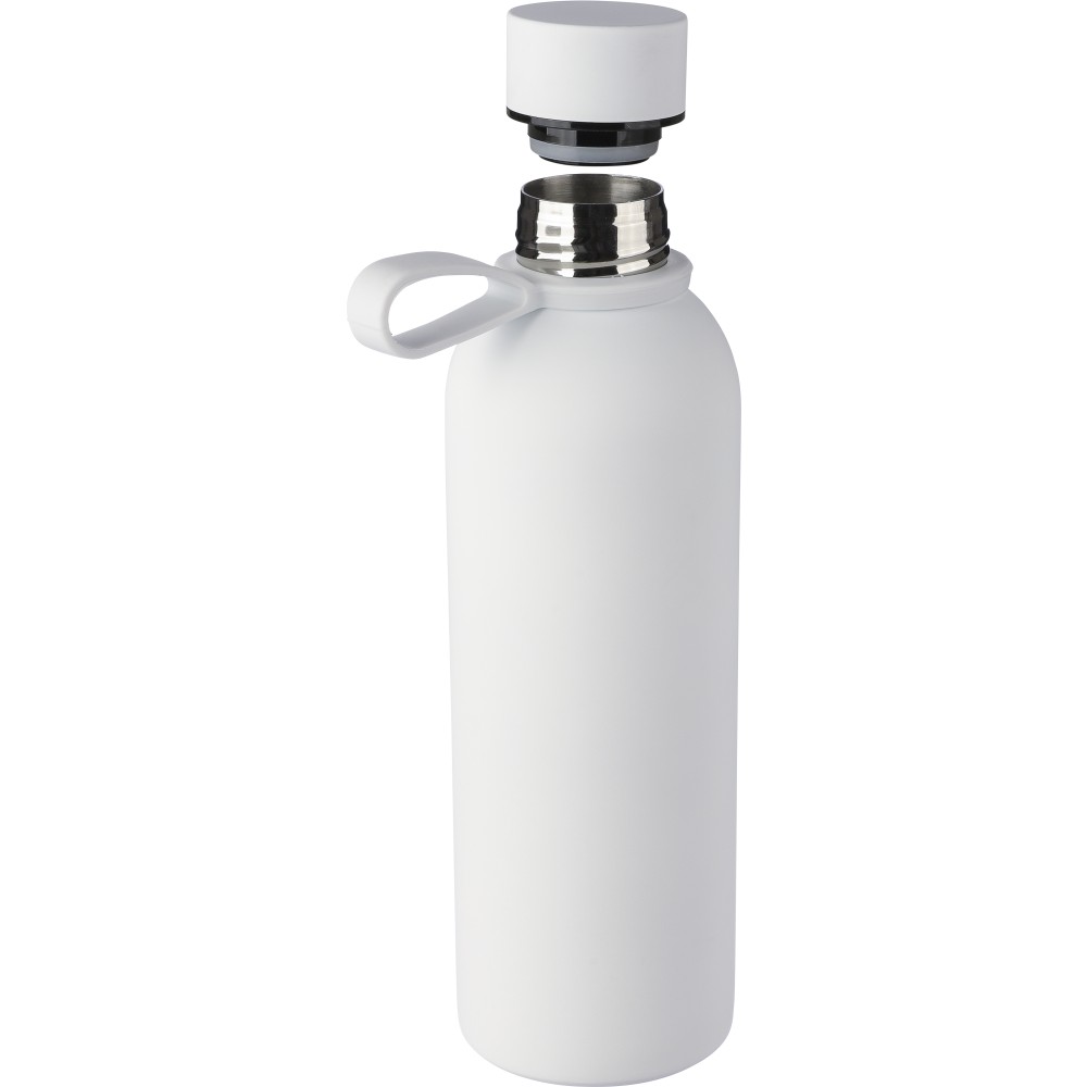 Újrahasznosított rozsdamentes acélból készült duplafalú vákuumpalack, 500 ml-es. 304-es rozsdamentes acél belsővel és 201-es rozsdamentes acél külsővel. Gumírozott felülettel, fém díszítésű csavaros PP kupakkal és szilikon hordfüllel. Gravírozott, újrahasznosított logóval. Csomagolása barna papírdoboz.