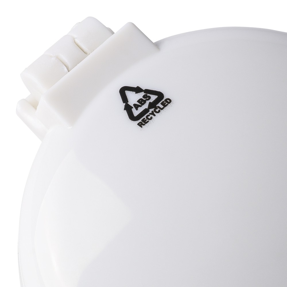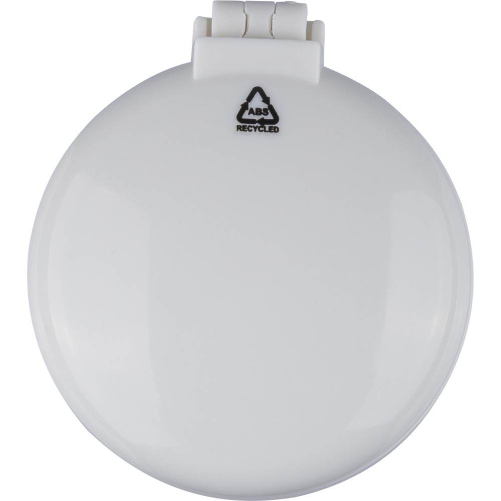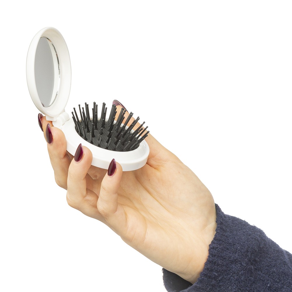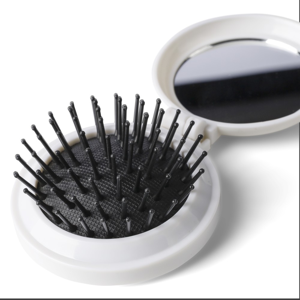 Újrahasznosított ABS-ből hajkefe és tükör, praktikus kialakítású útközbeni használatra, a terméken újrahasznosított alapanyagra utaló megjelölés található.
