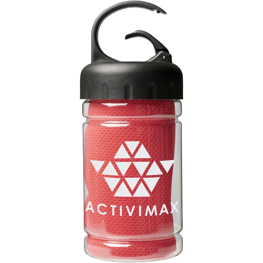 Hűtőtörölköző PET tartóban. A törököző mérete: 30 x 80 cm. 100% poliészter.