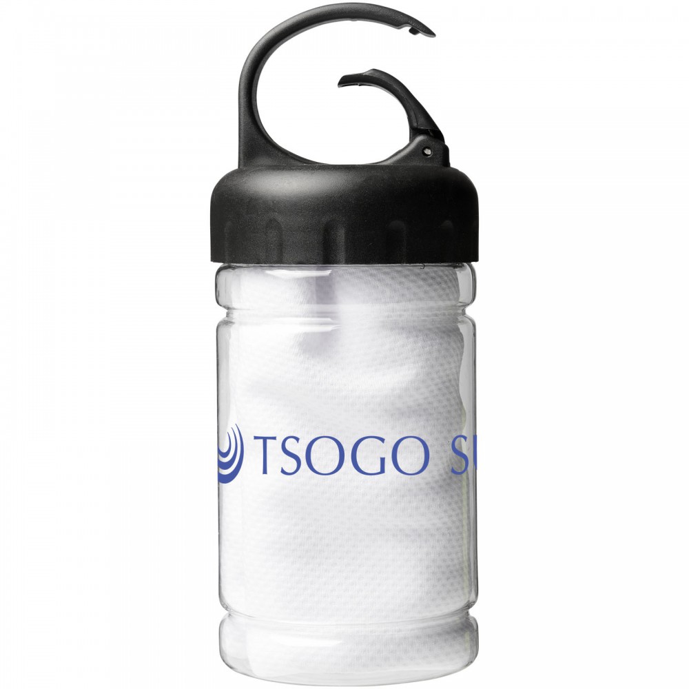 Hűtőtörölköző PET tartóban. A törököző mérete: 30 x 80 cm. 100% poliészter.