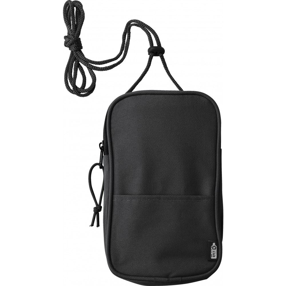 Nyakbaakasztható kistáska egy cipzáros résszel és egy nyitott zsebbel, állítható pánttal. 600D RPET anyag.