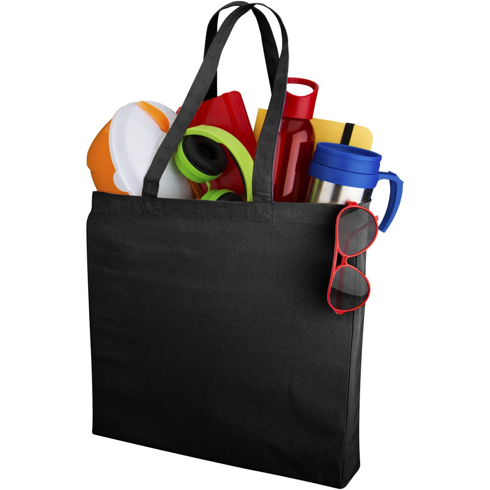 Nyitott tetejű táska háromszög alakú oldalbetéttel. A lehajtható fülek magassága 31 cm. 220 g/m2 pamut.