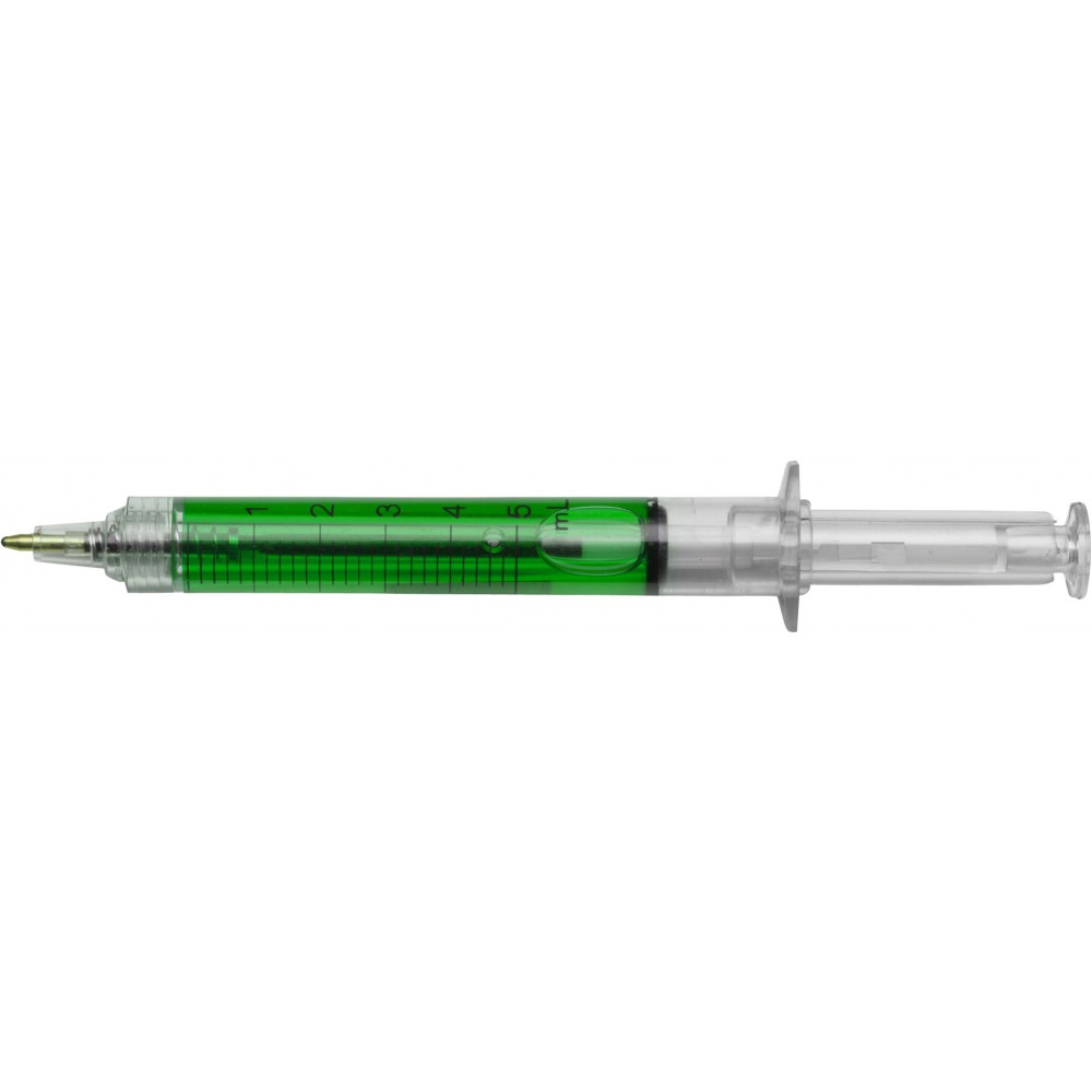 Injekció formájú golyóstoll színes folyadékkal töltve, fekete tollbetéttel.