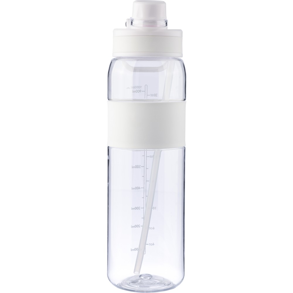 Tritán kulacs, 900 ml-es. Kétféle használati lehetőséggel: csavaros záródású kupak vagy visszahajtható végű szívószál. Szilikon markolattal, PP hordozófüllel és nyomtatott űrtartalom-jelzővel.